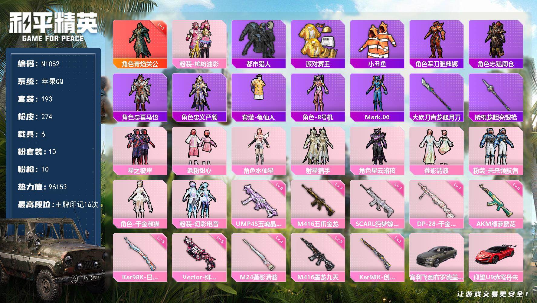 1神装-10粉装-10特效枪-6载具-4粉色飞行器-96153热力值-16王牌印记-193套装-274枪皮