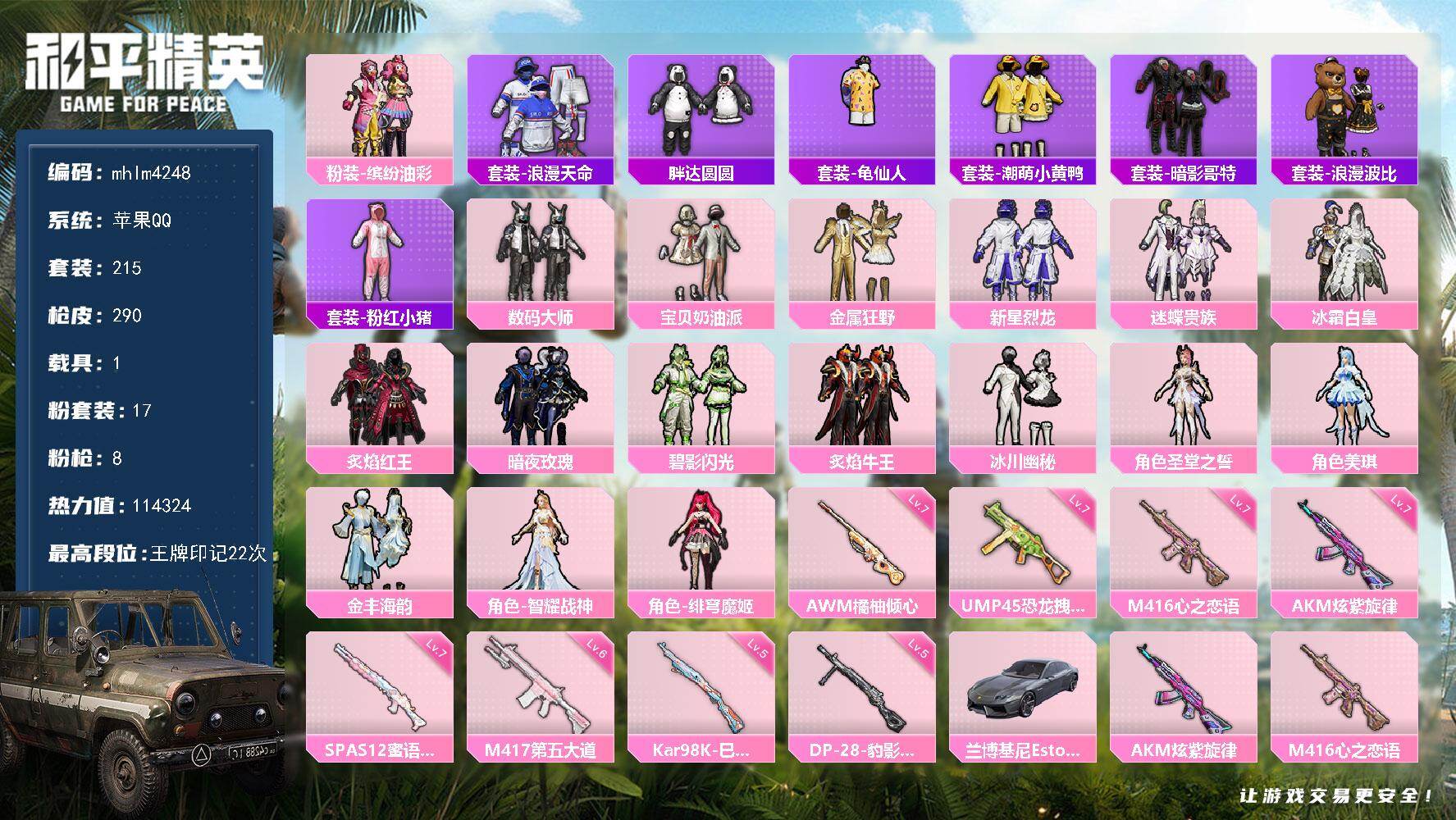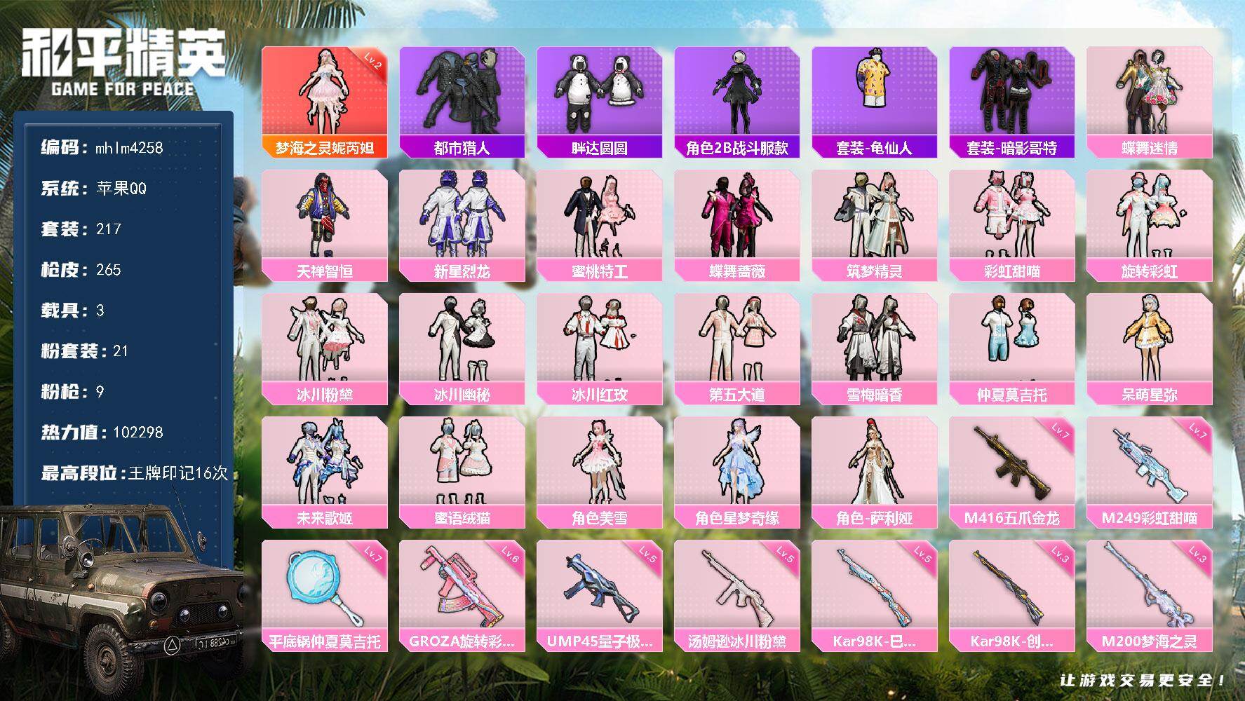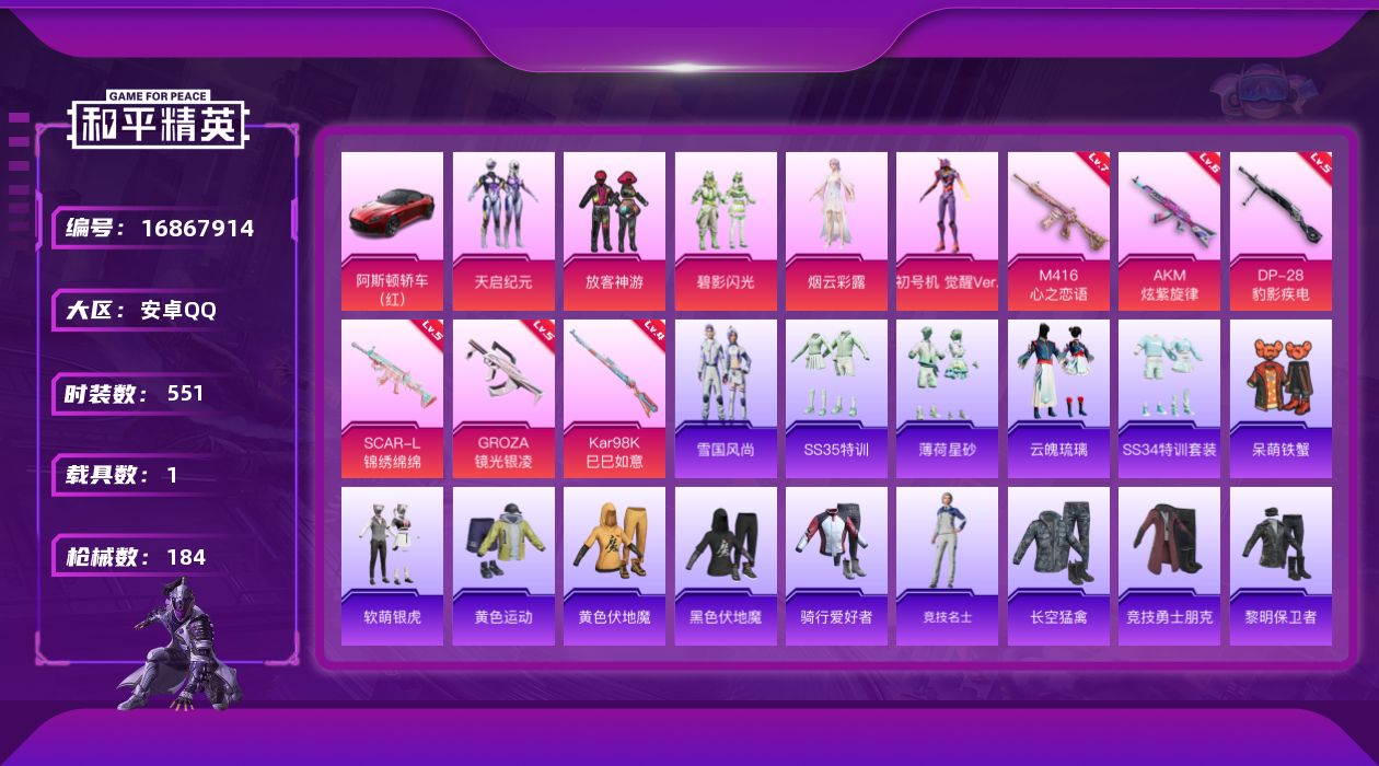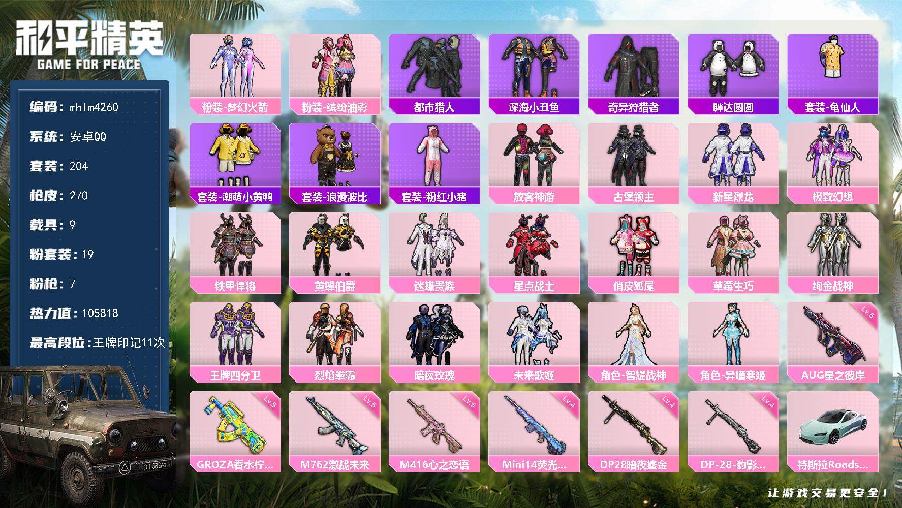 安卓 手Q-1神装-2粉装-4特效枪-0载具-1粉色飞行器-44780热力值-