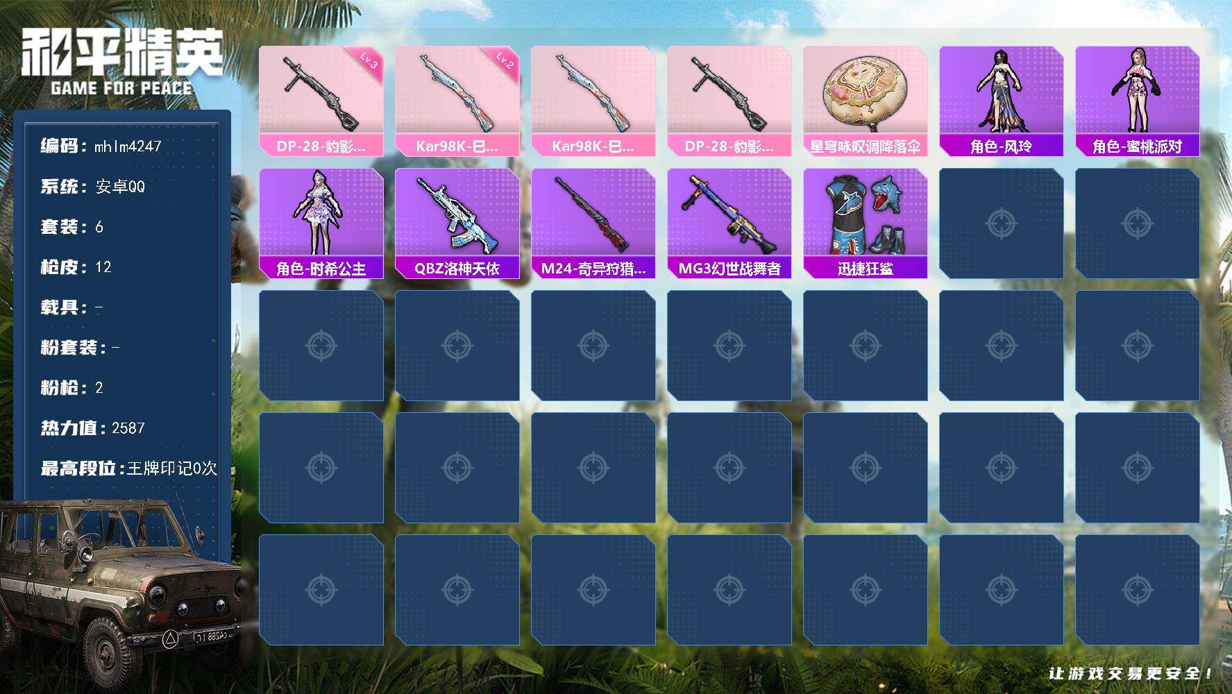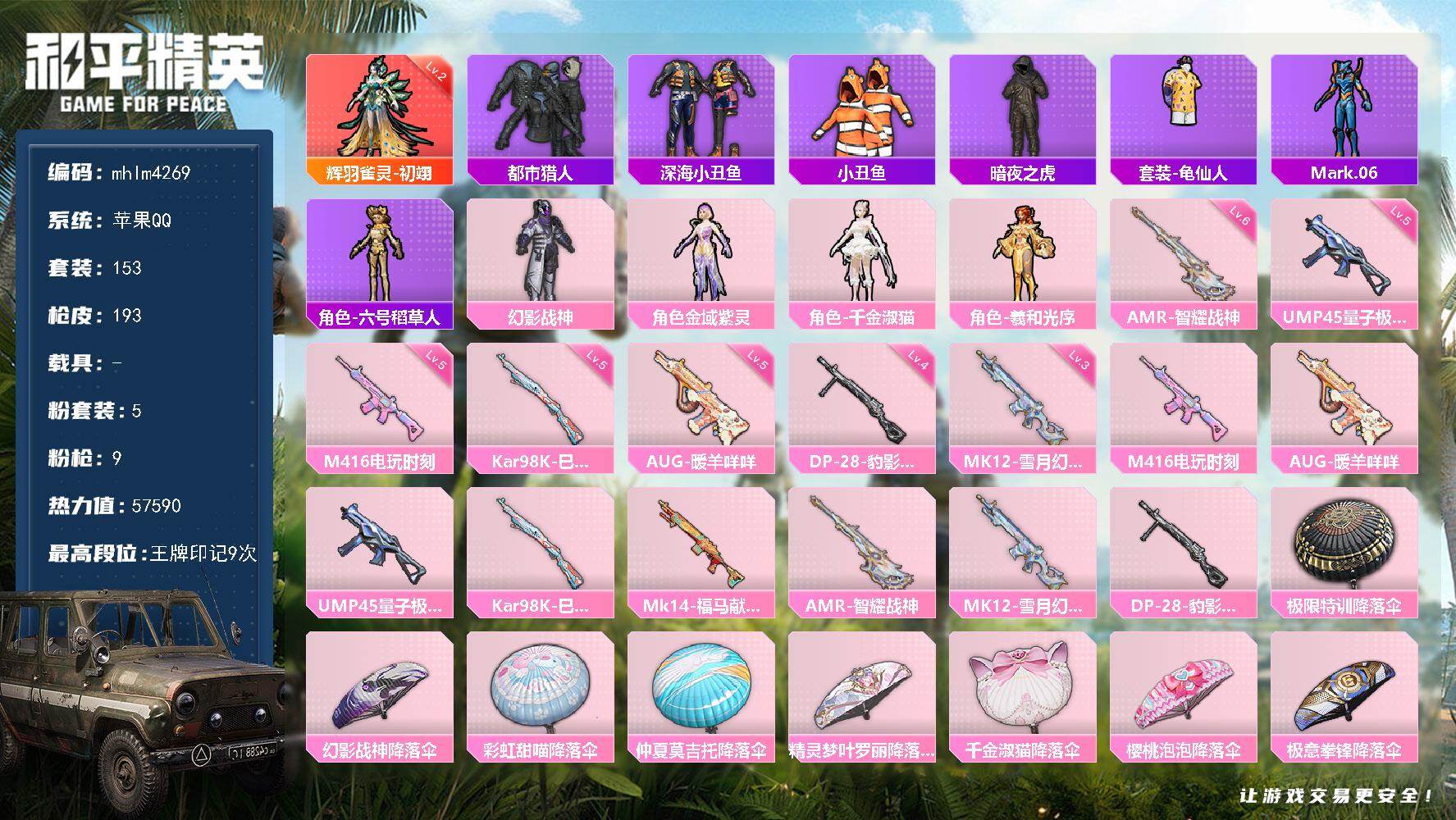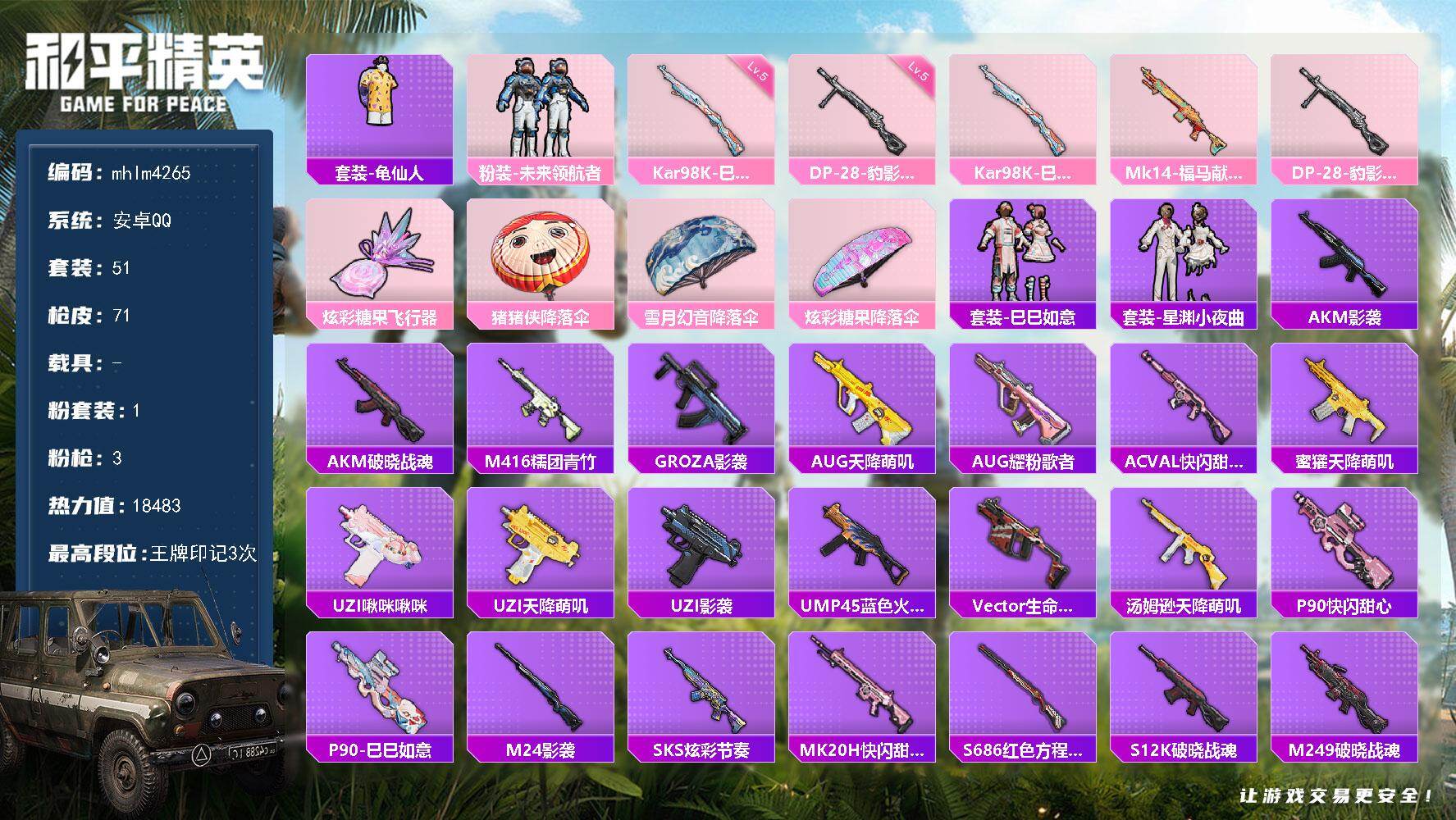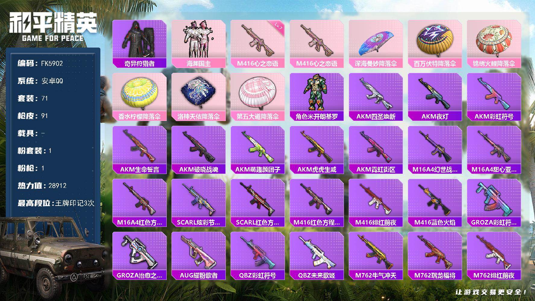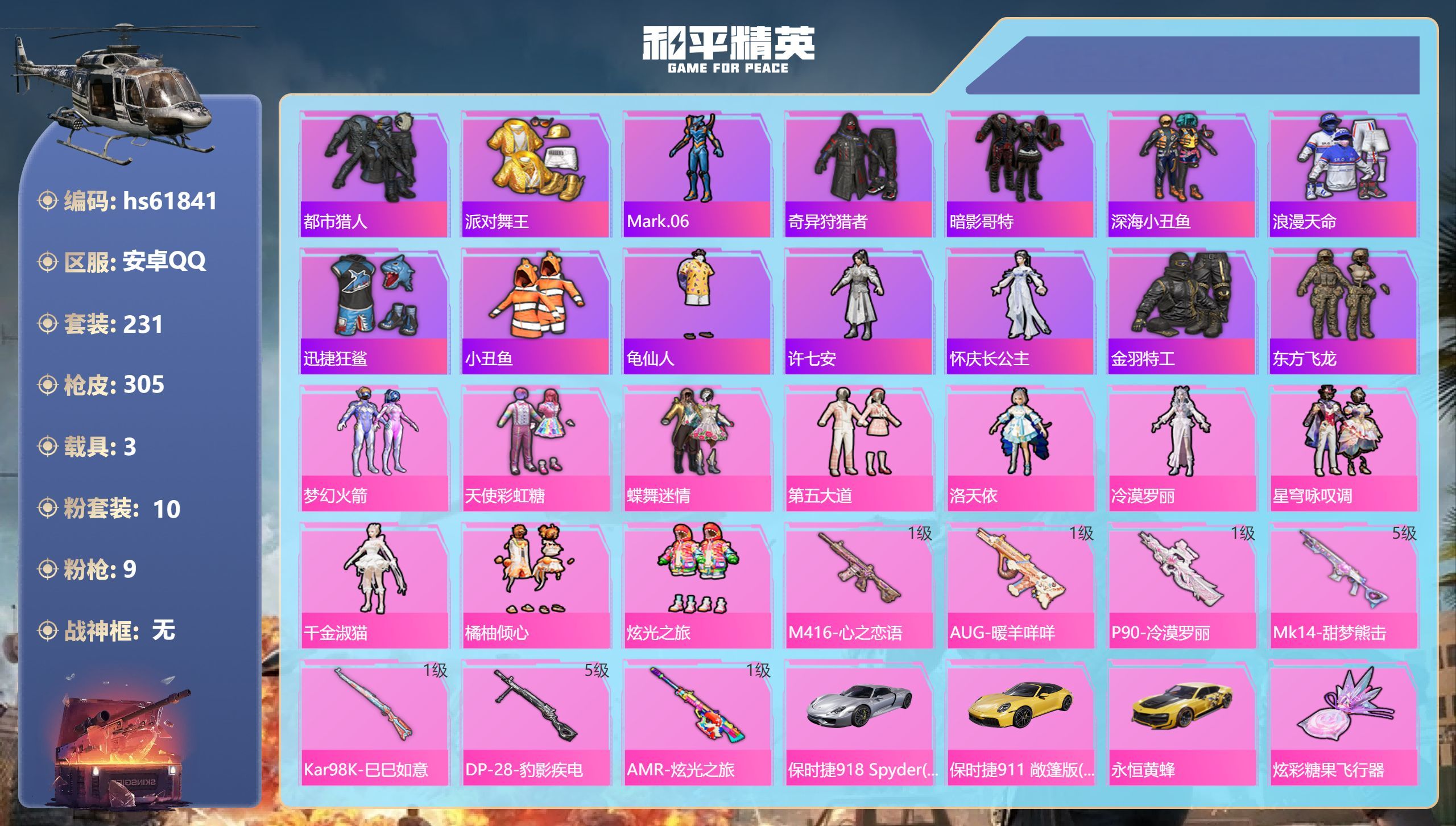 hs61841 安卓手Q-14王牌印记-10粉装-9特效枪-3载具-96765热力值-231套装-3