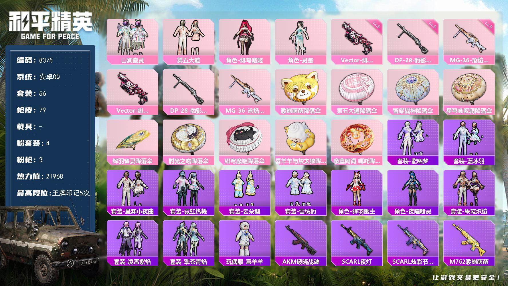 【8375】安卓 手Q-4粉装-3特效枪-0载具-0粉色飞行器-21968热力