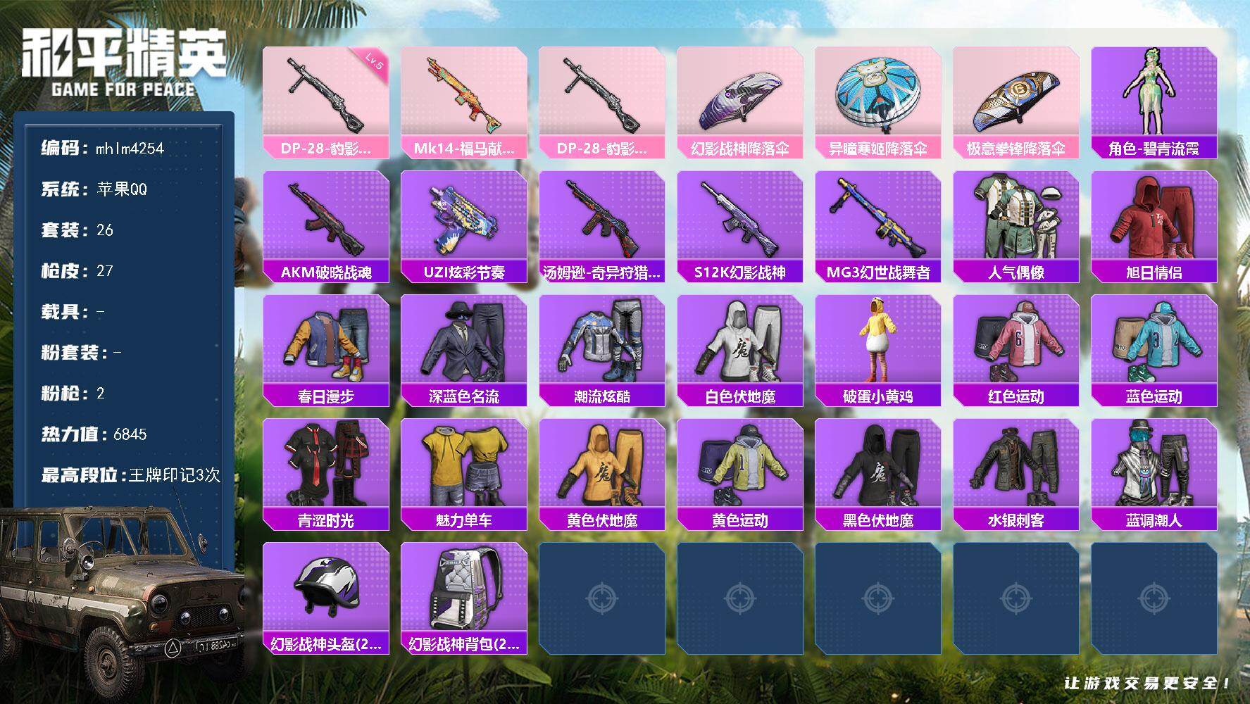 苹果 手Q-6粉装-6特效枪-0载具-3粉色飞行器-38108热力值-5王牌印