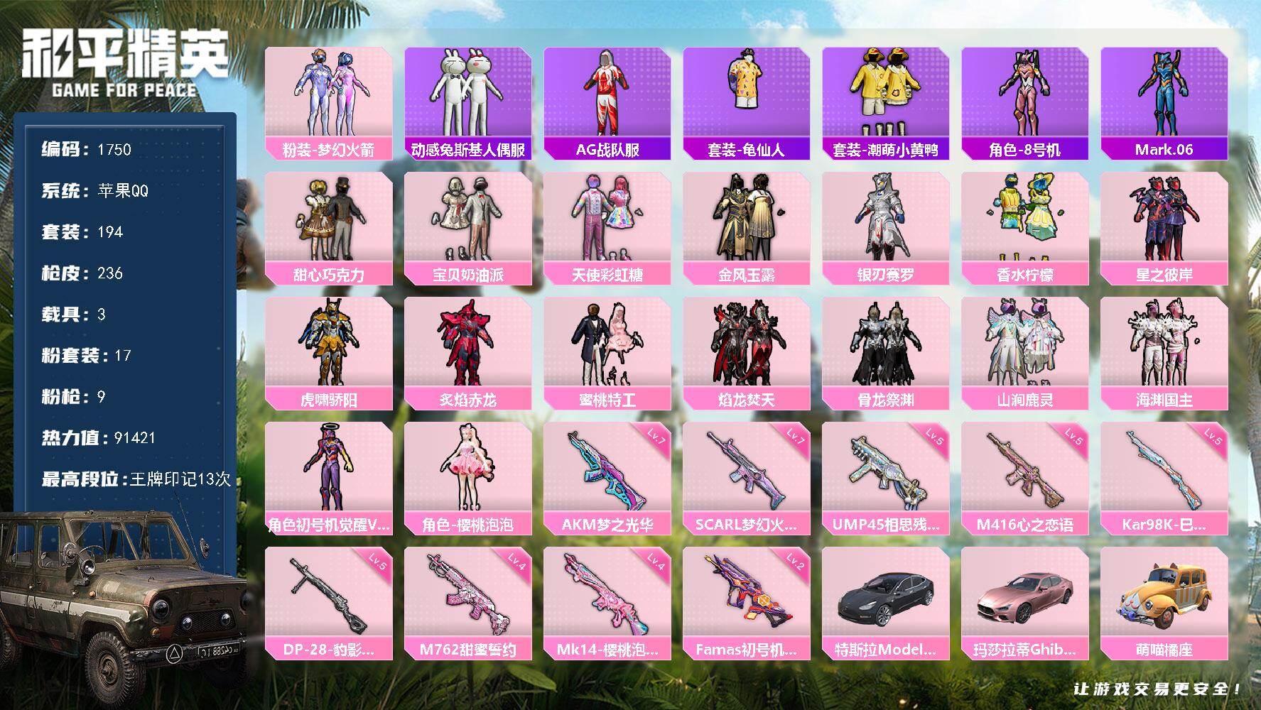 苹果 手Q-17粉装-9特效枪-3载具-5粉色飞行器-91421热力值-13王
