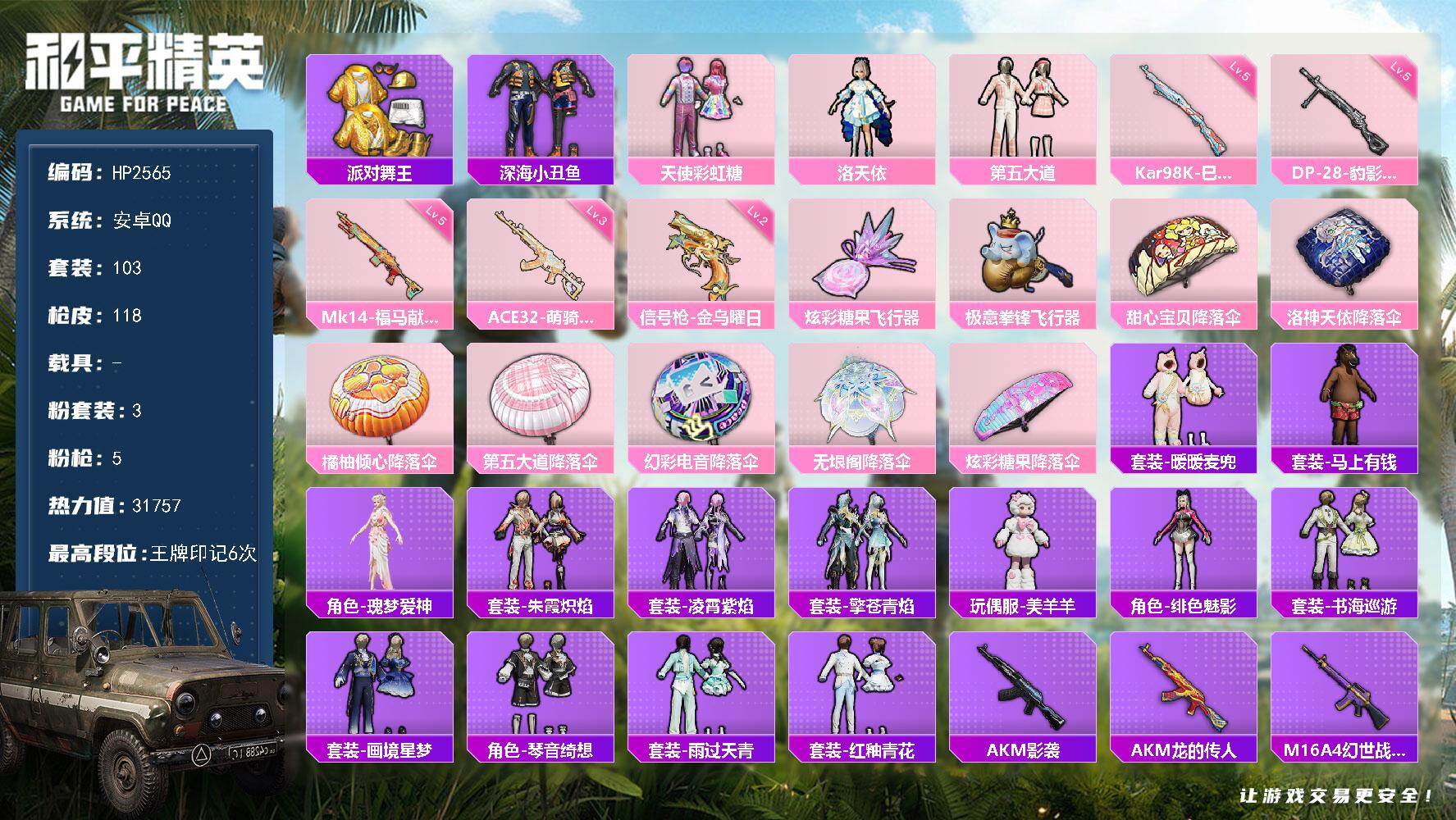 7粉装-2特效枪-1载具-1粉色飞行器-26415热力值-8王牌印记-66套装-83枪皮