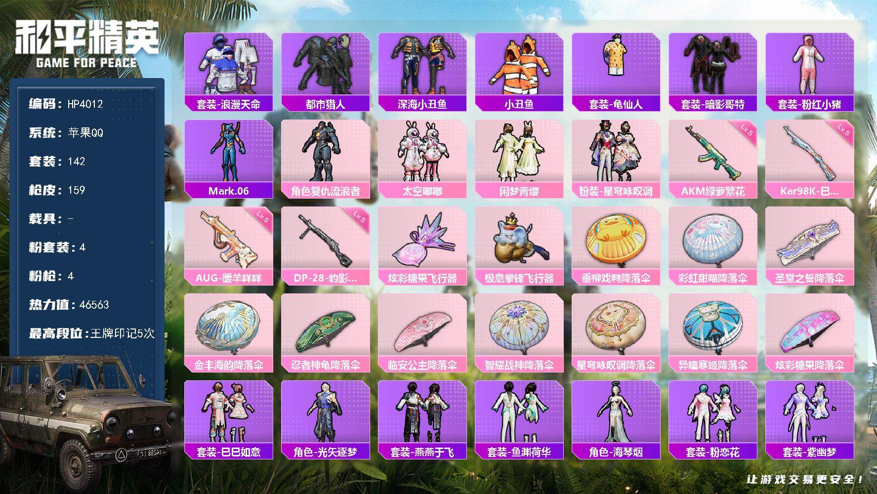 2粉装-11特效枪-0载具-0粉色飞行器-46509热力值-9王牌印记-109套装-159枪皮