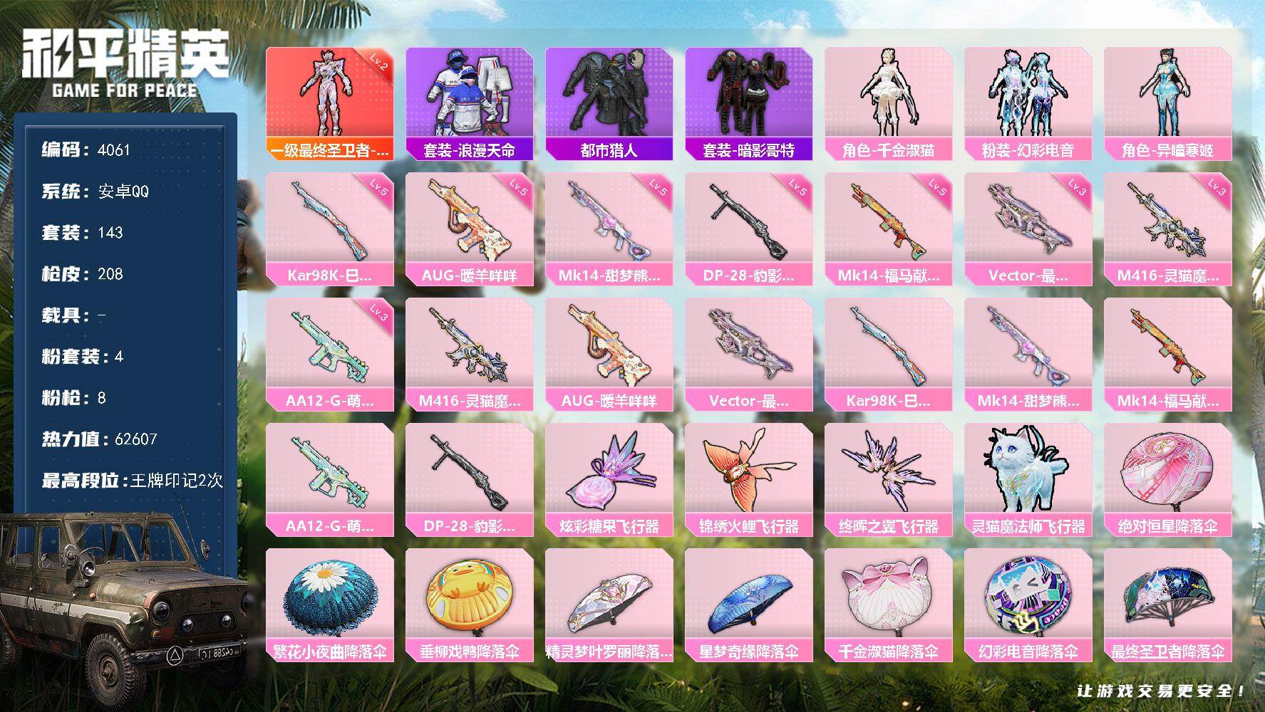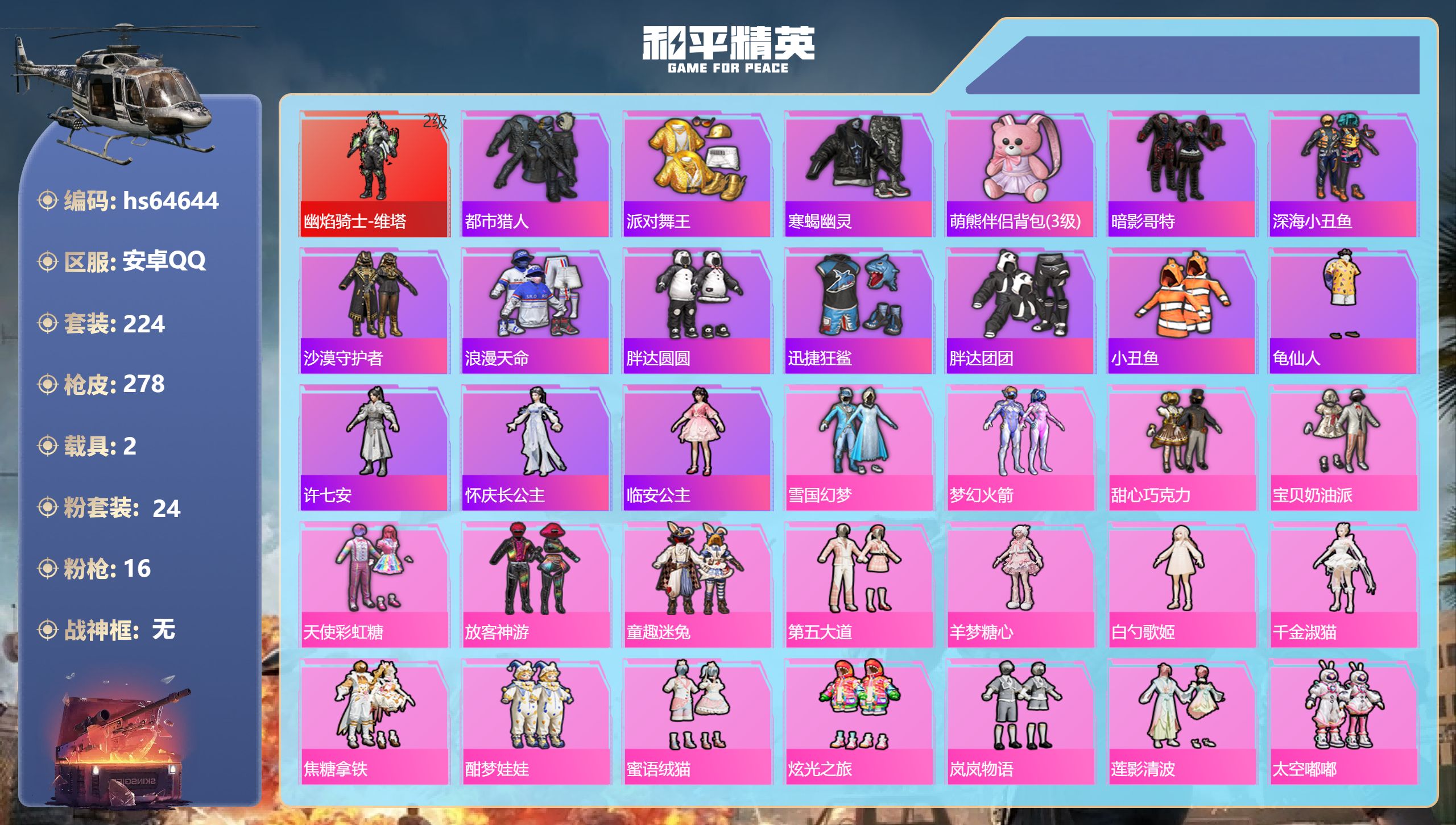 安卓手Q-20王牌印记-1红装-10粉装-12特效枪-2载具-热力值-262套装