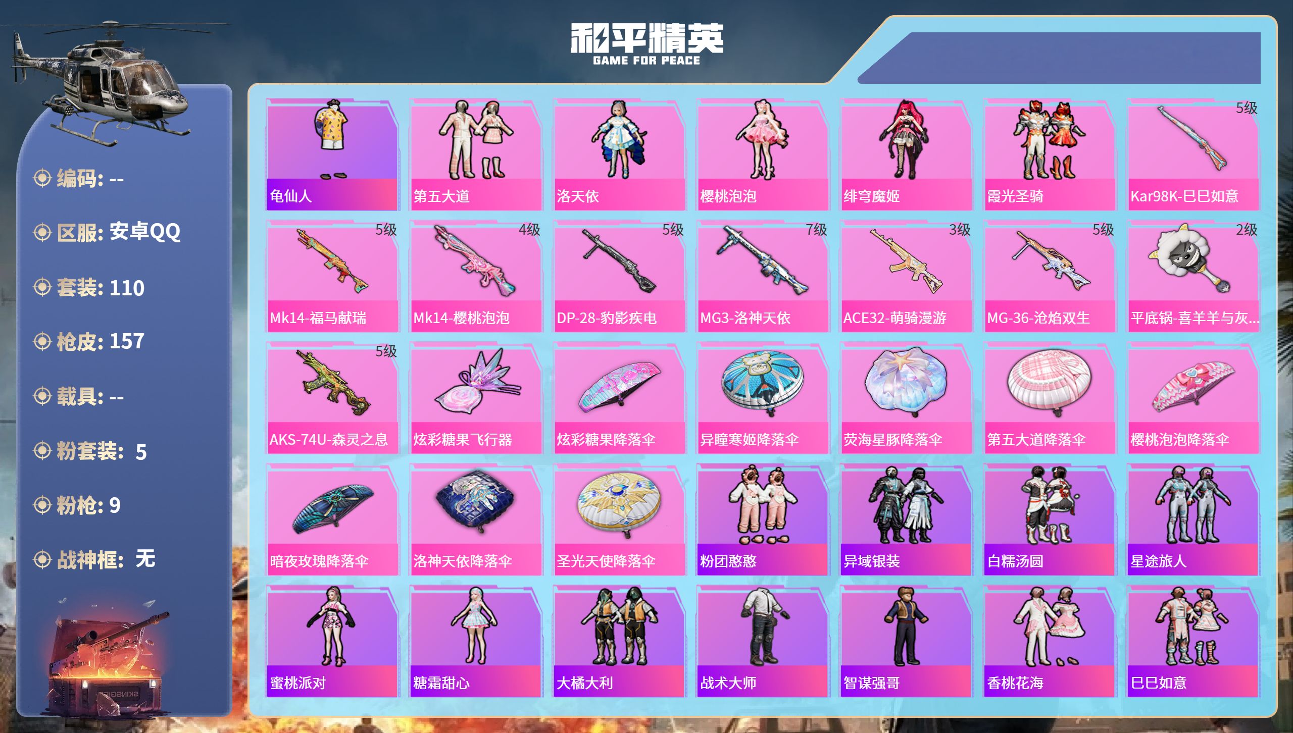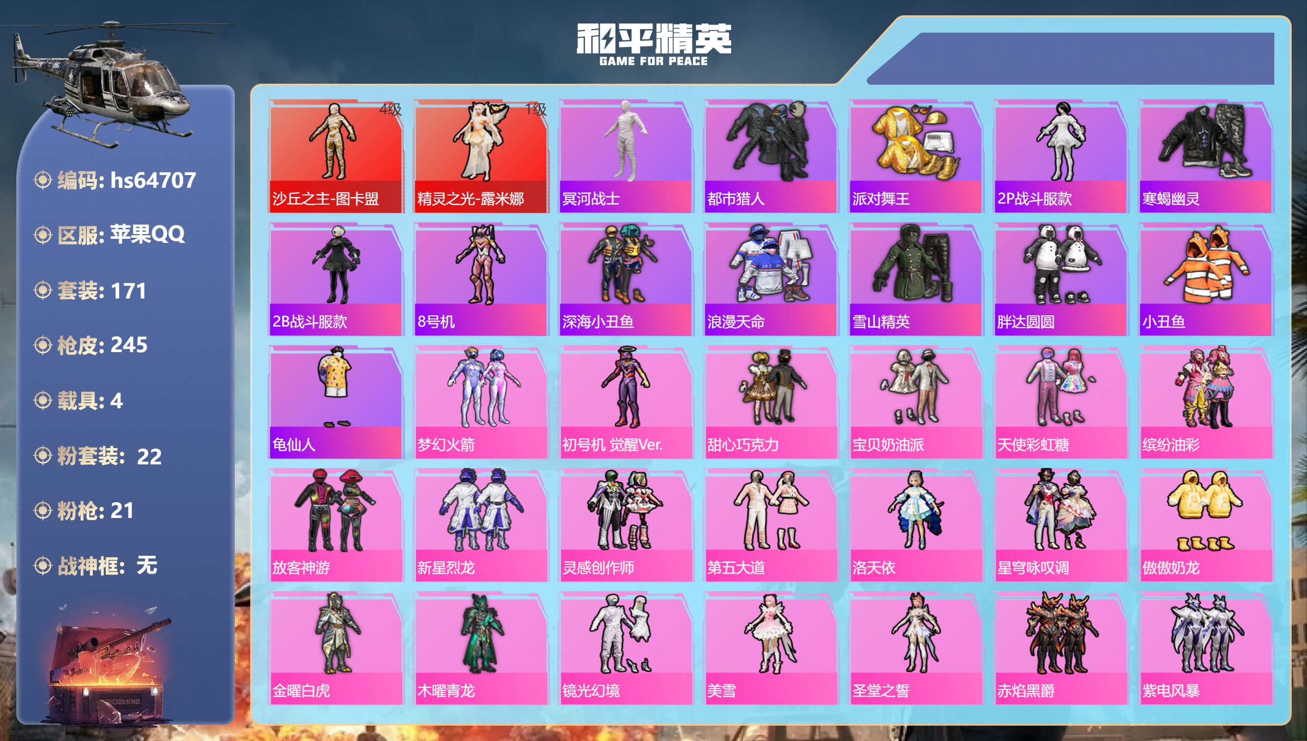 131套装/枪械5/装备223/载具1/战备112/王牌印记7/热力值58234