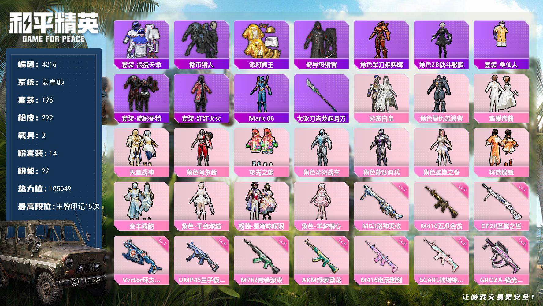 196套装/枪械22/装备430/载具2/战备247/王牌印记15/热力值/五级