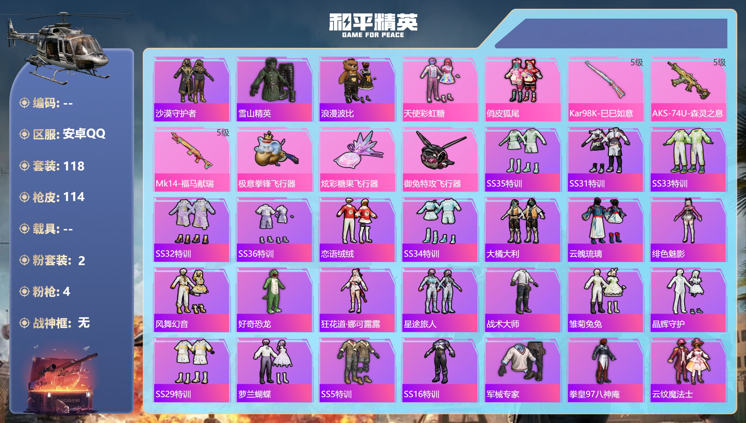 安卓手Q-1王牌印记-2粉装-7特效枪-29448热力值-70套