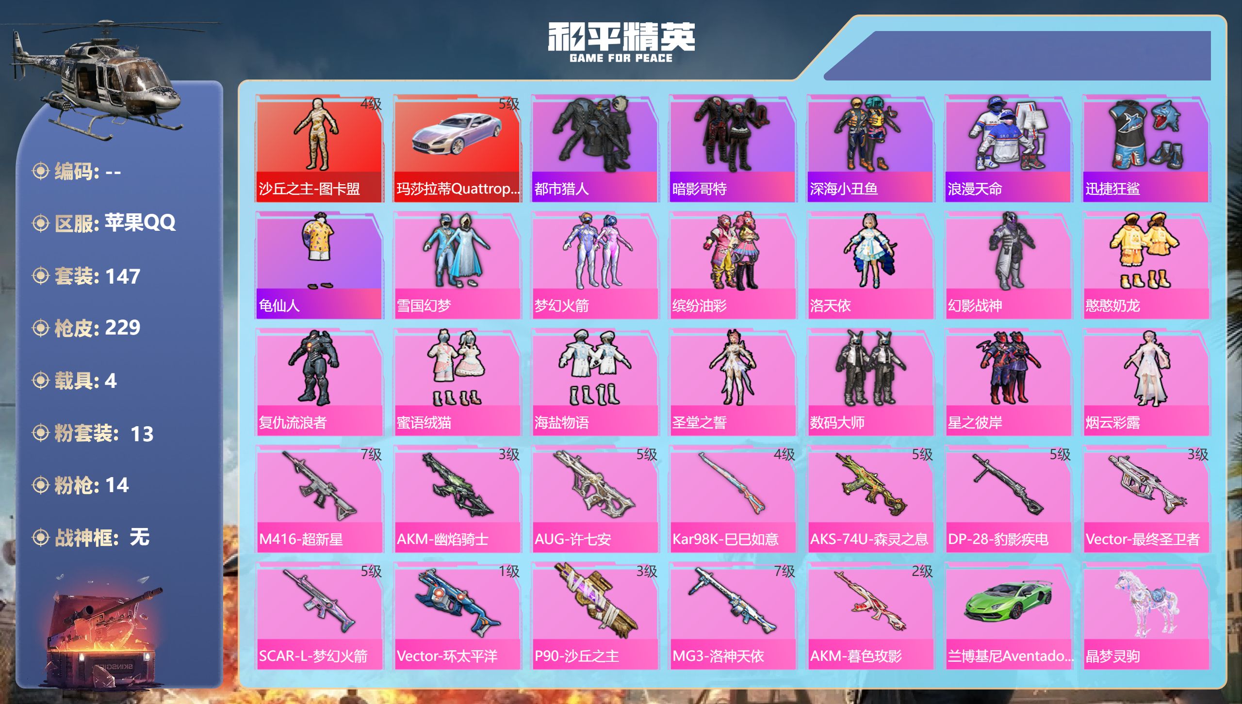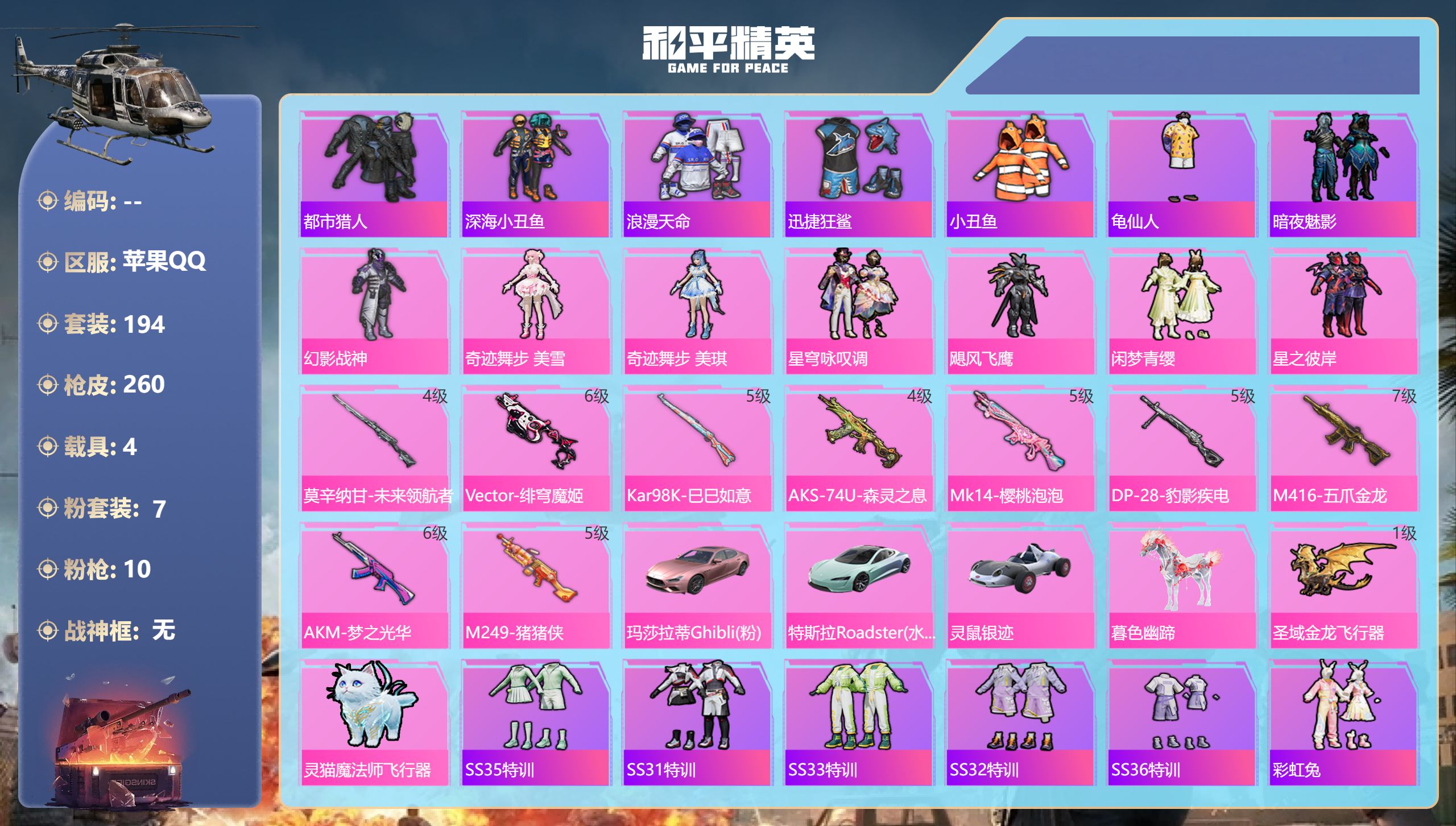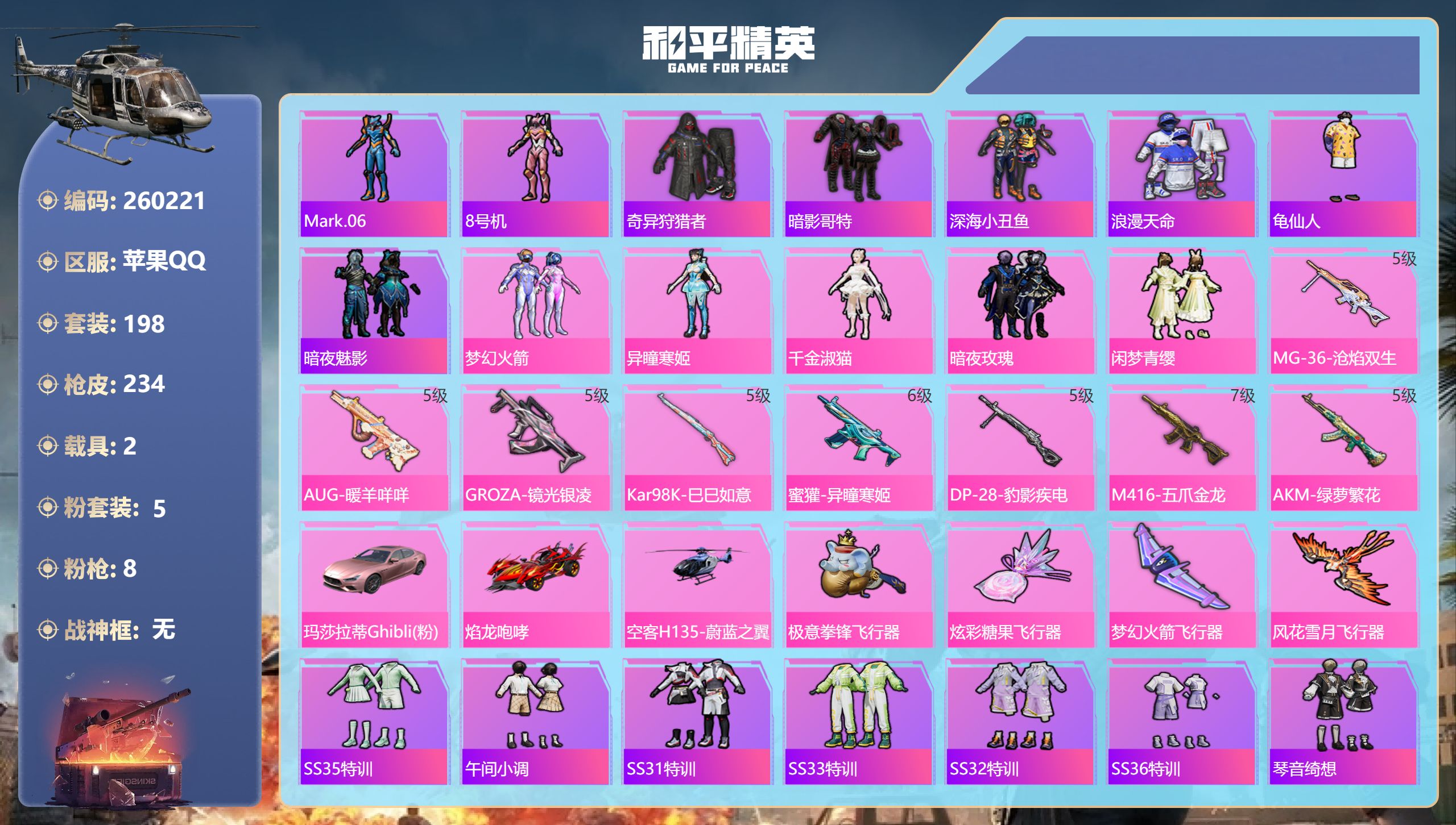 苹果微信-19王牌印记-2红装-8粉装-13特效枪-2载具-热力值-187套装-