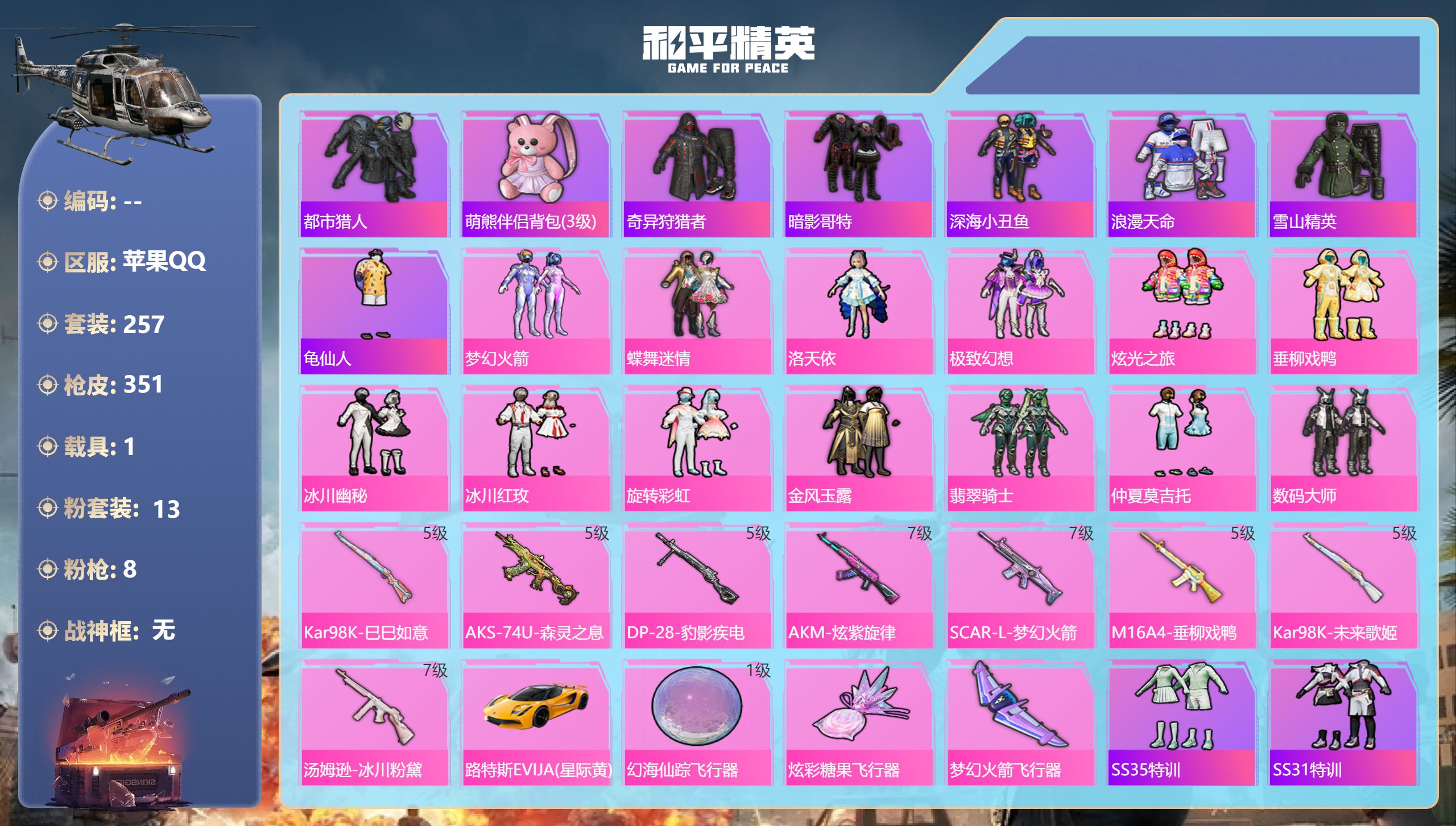 苹果手Q-14王牌印记-1红装-4粉装-8特效枪-1载具-689