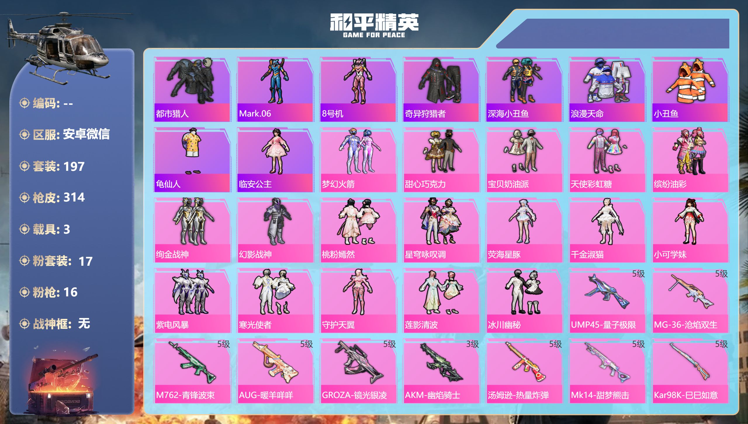 128套装/枪械8/装备224/载具2/战备136/王牌印记11/热力值5259