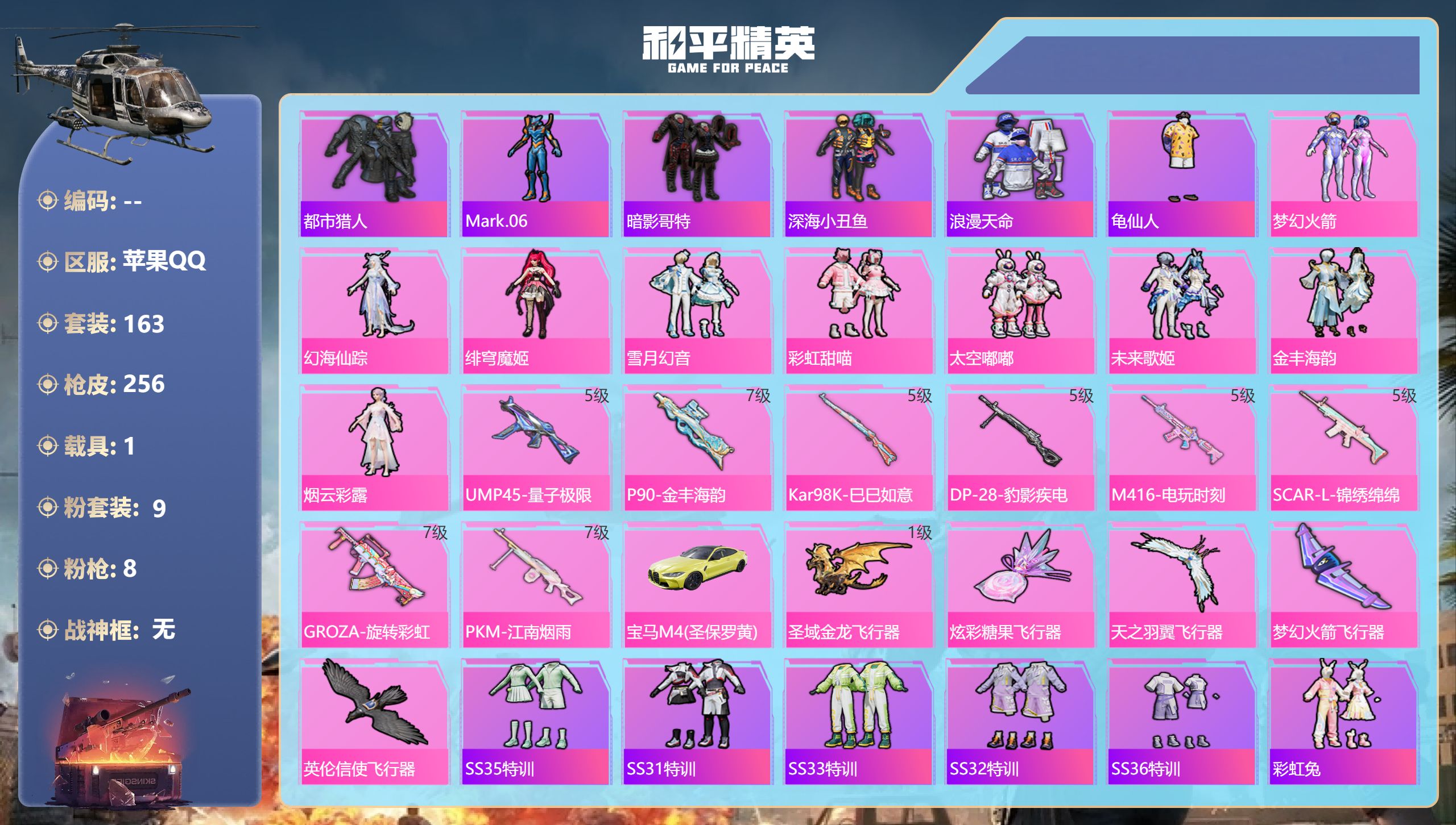 8王牌印记-1红装-6粉装-12特效枪-1载具