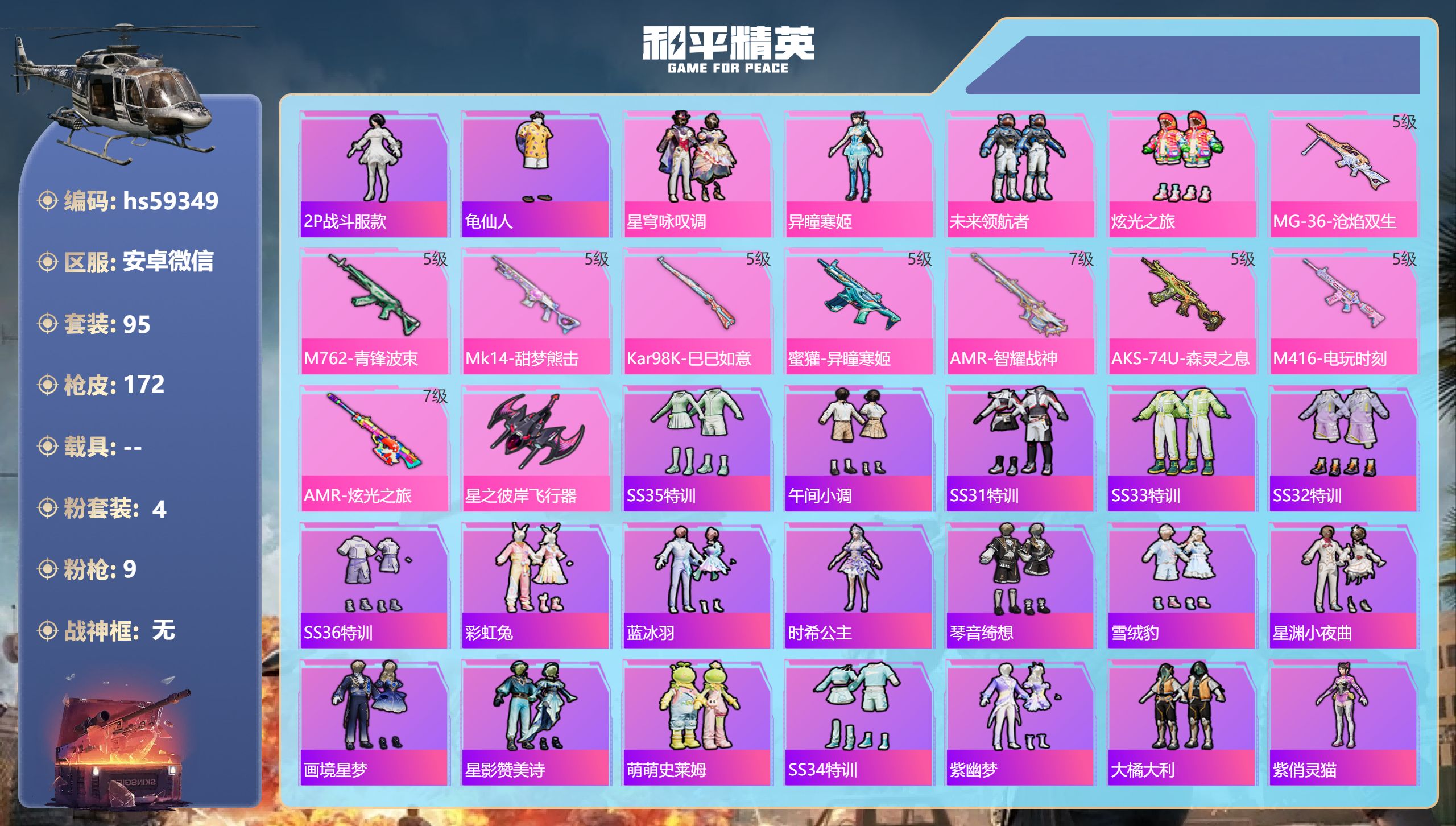 安卓微信-0王牌印记-1粉装-4特效枪-24804热力值-55套