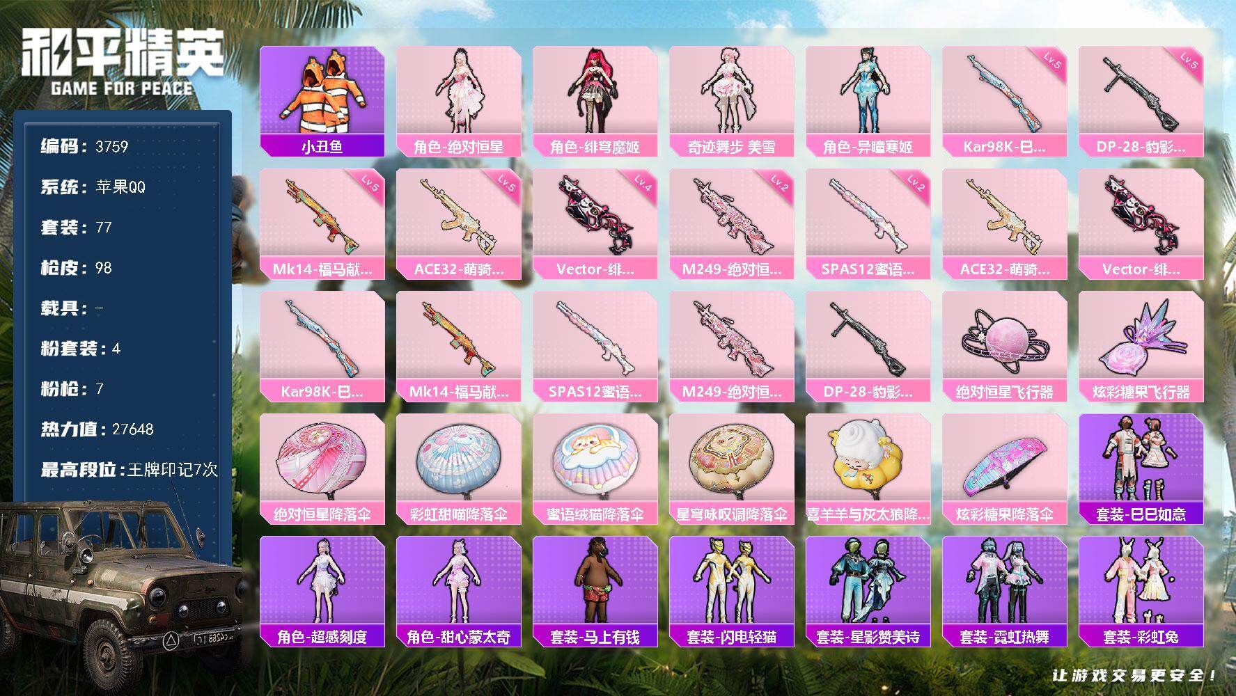 3王牌印记-1粉装-8特效枪-1载具-32294热力值