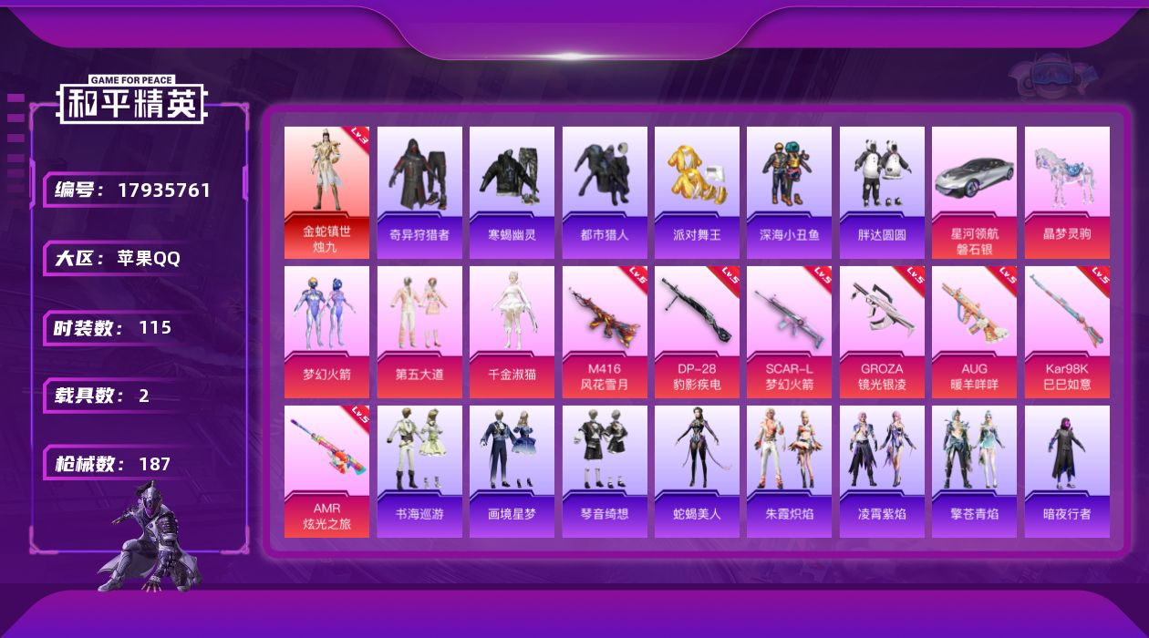 苹果手Q-1王牌印记-1红装-3粉装-3特效枪-2载具-3284