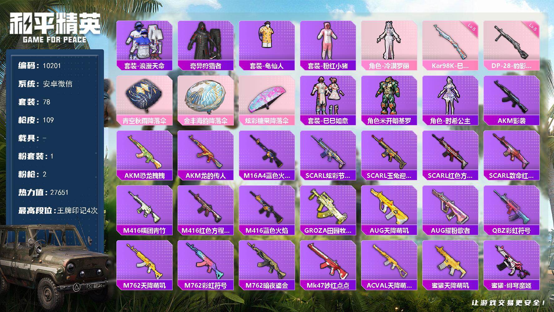 1粉装-2特效枪-0载具-0粉色飞行器-27651热力值-4王牌印记-78套装-109枪皮