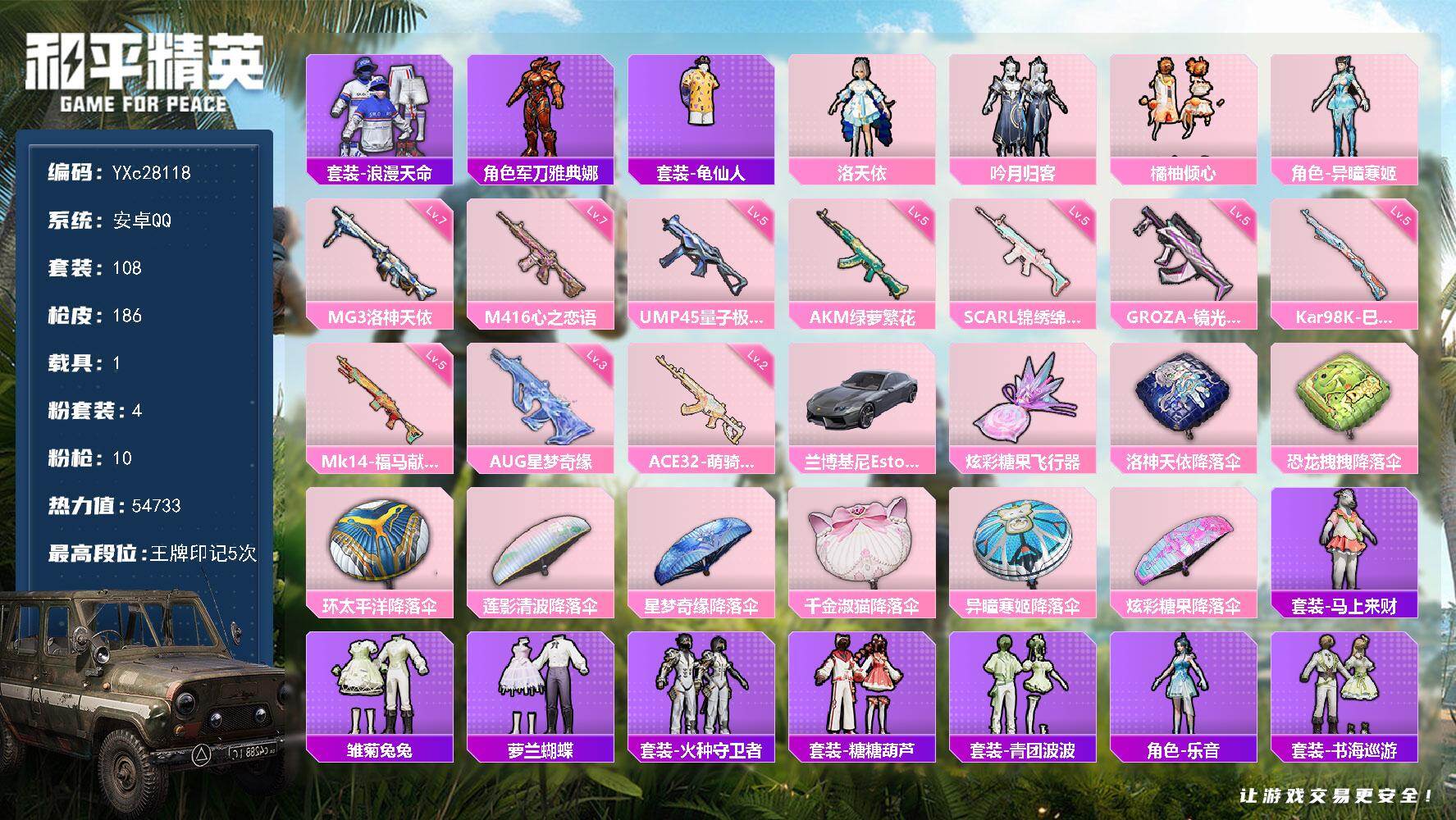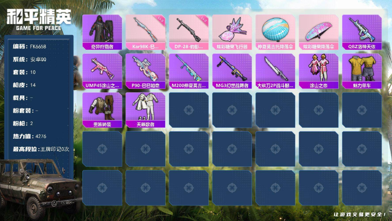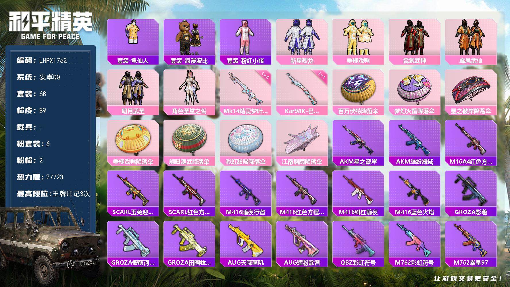 安卓 手Q-3粉装-6特效枪-1载具-2粉色飞行器-56064热力值-13王牌