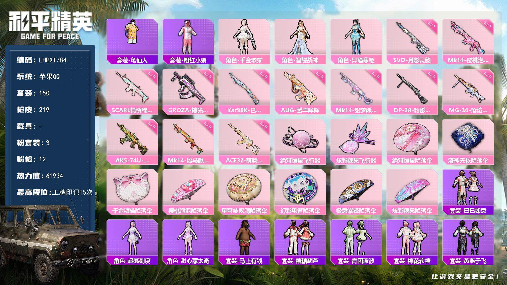 3粉装-12特效枪-2粉色飞行器-61934热力值-15王牌印记-150套装-219枪皮