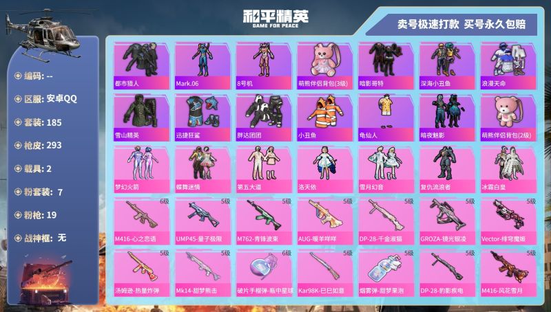 hs39817 安卓手Q-12王牌印记-22粉装-8特效枪-4载具-97002热力值-200套装-2