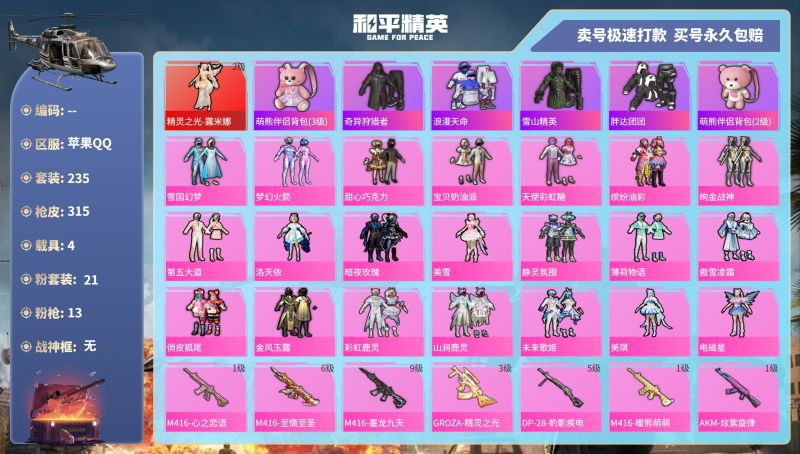 hs45554 苹果手Q-19王牌印记-21粉装-13特效枪-4载具-116787热力值-235套装