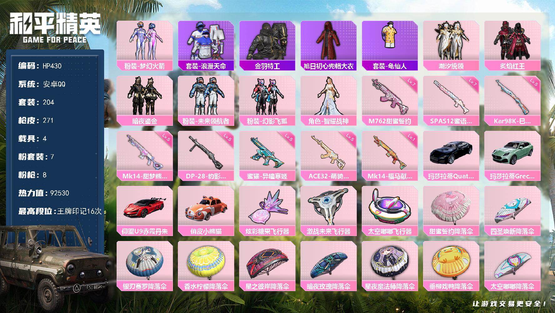 【秒换绑】安卓 手Q-7粉装-8特效枪-4载具-4粉色飞行器-92530热力值