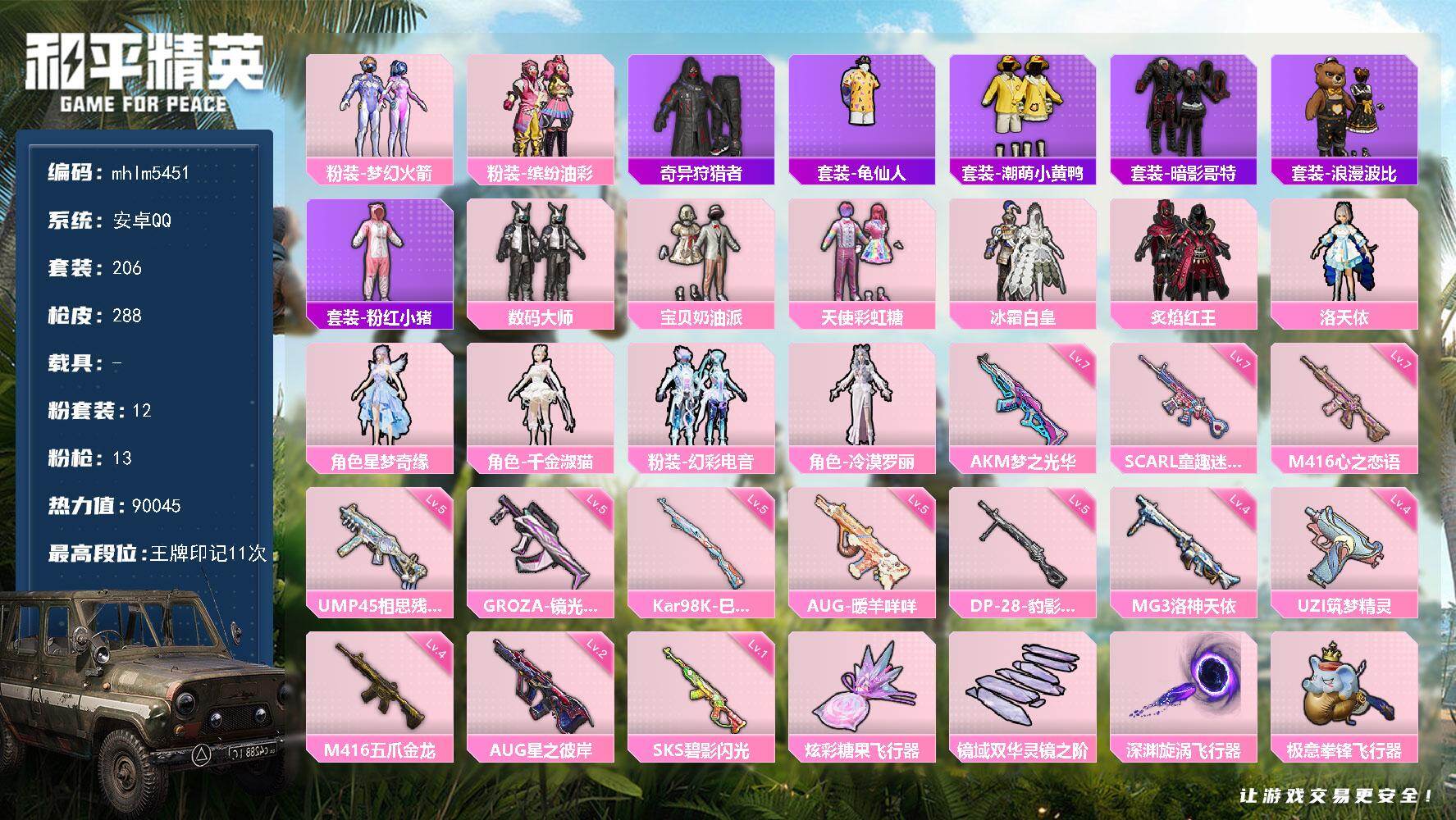 安卓 手Q-5粉装-4特效枪-0载具-4粉色飞行器-36823热力值-5王牌印