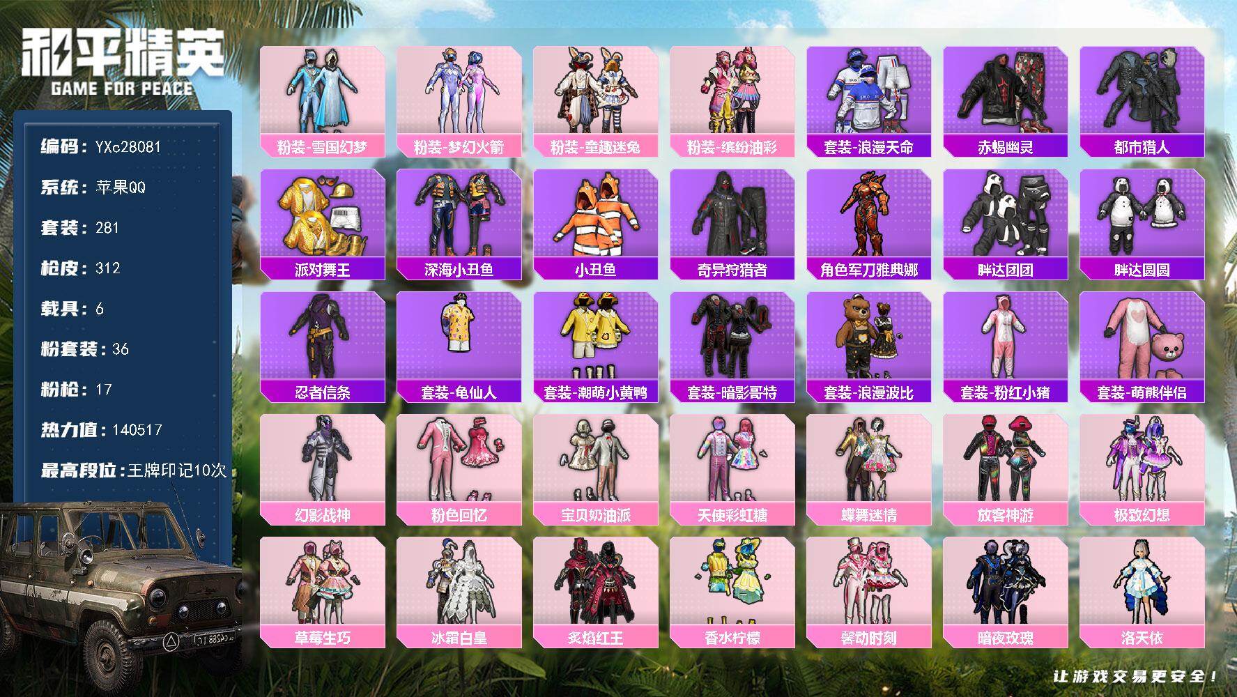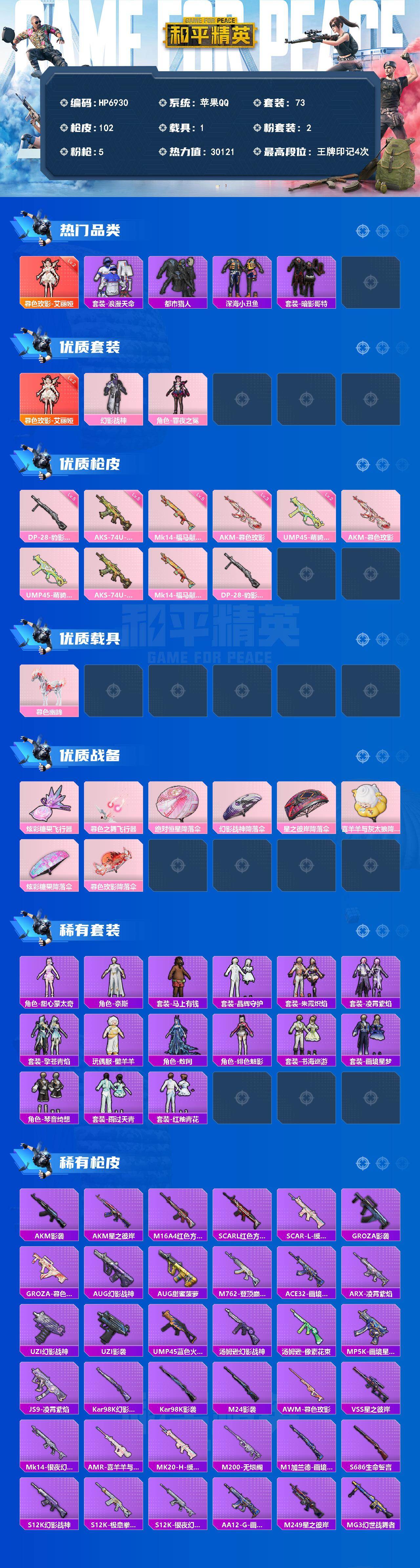 hs63670苹果手Q-17王牌印记-4粉装-6特效枪-2载具-73374热力值-178套装-224
