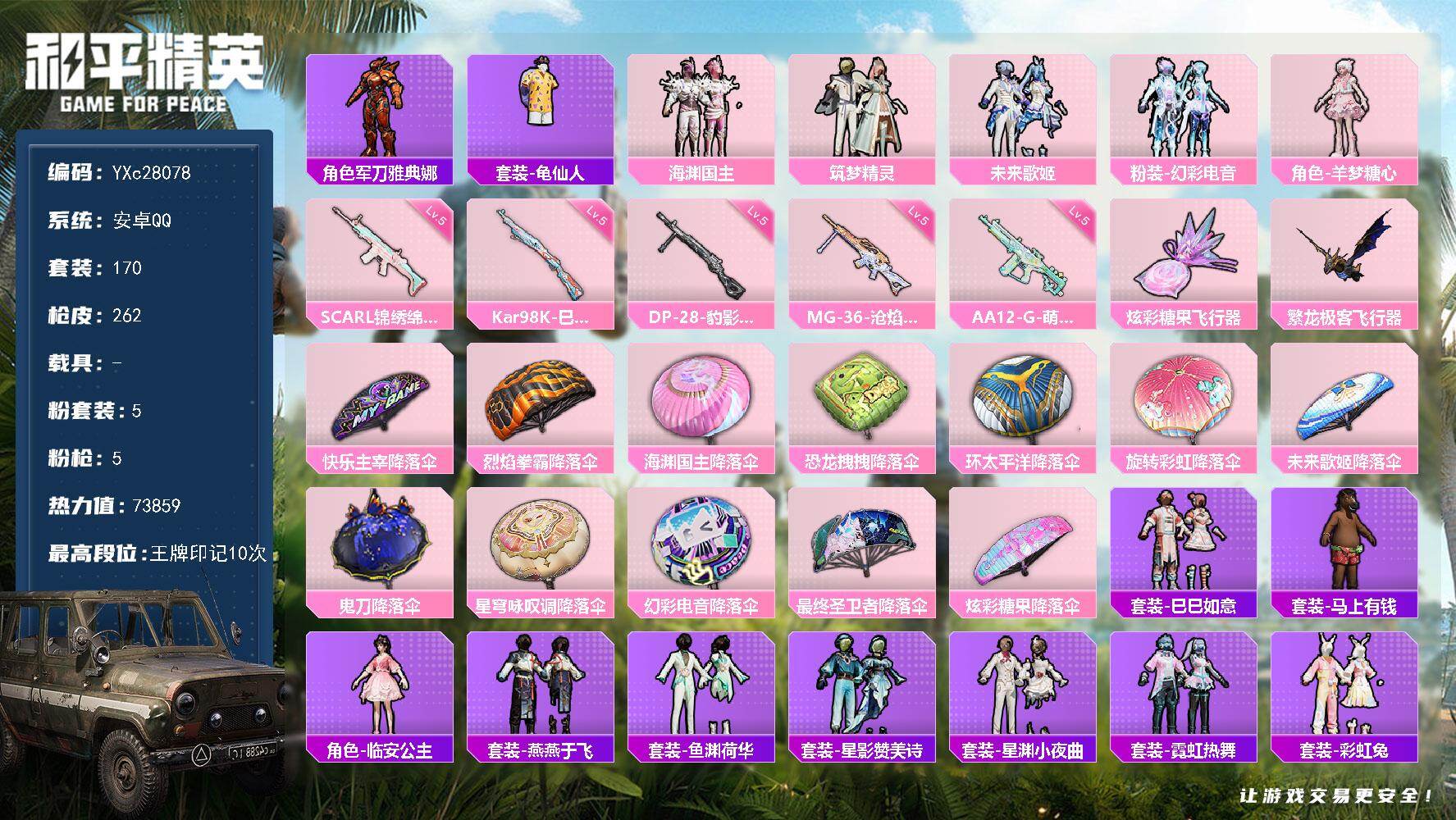 hs65647 安卓手Q-12王牌印记-6粉装-8特效枪-77893热力值-172套装-275枪皮-