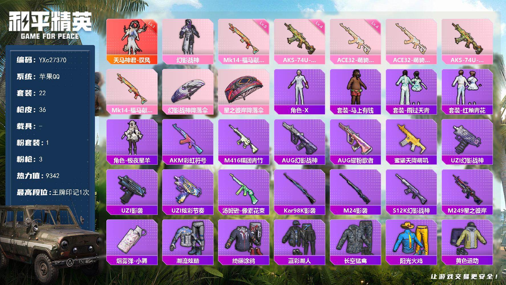 1稀有3载具18粉装5特效枪29热门170套装203枪皮 7w热力值 1印记 历史超级王牌1星