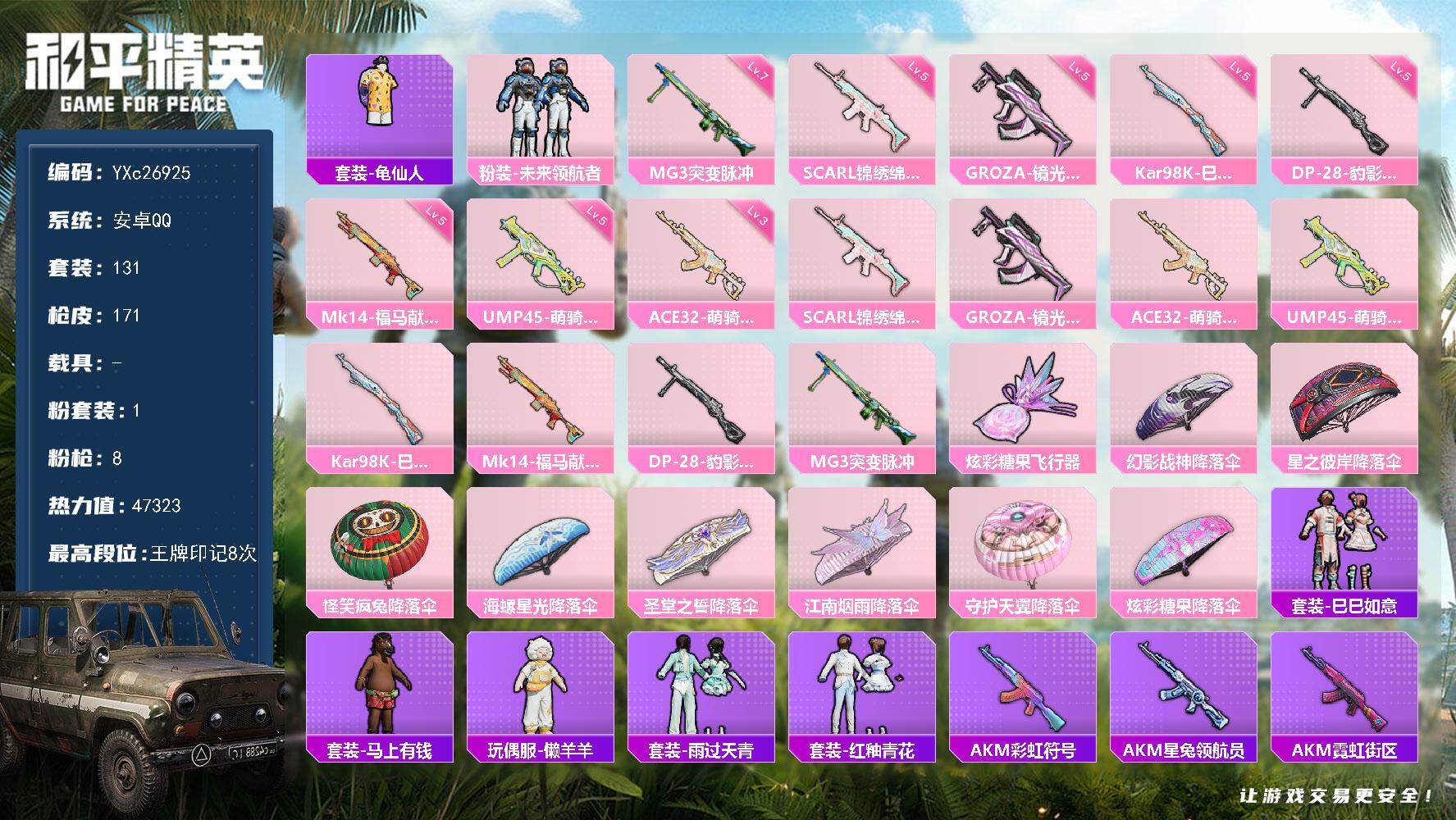 10粉装-4特效枪-0载具-3粉色飞行器-79484热力值-18王牌印记-204套装-259枪皮