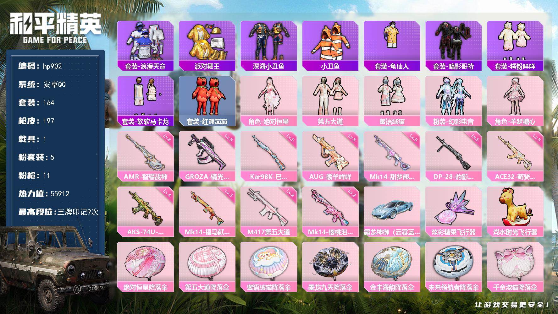 安卓 手Q-5粉装-11特效枪-1载具-2粉色飞行器-55912热力值-9王牌