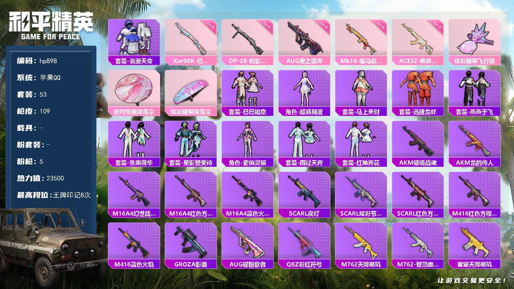 苹果 手Q-0粉装-5特效枪-0载具-1粉色飞行器-23500热力值-8王牌印