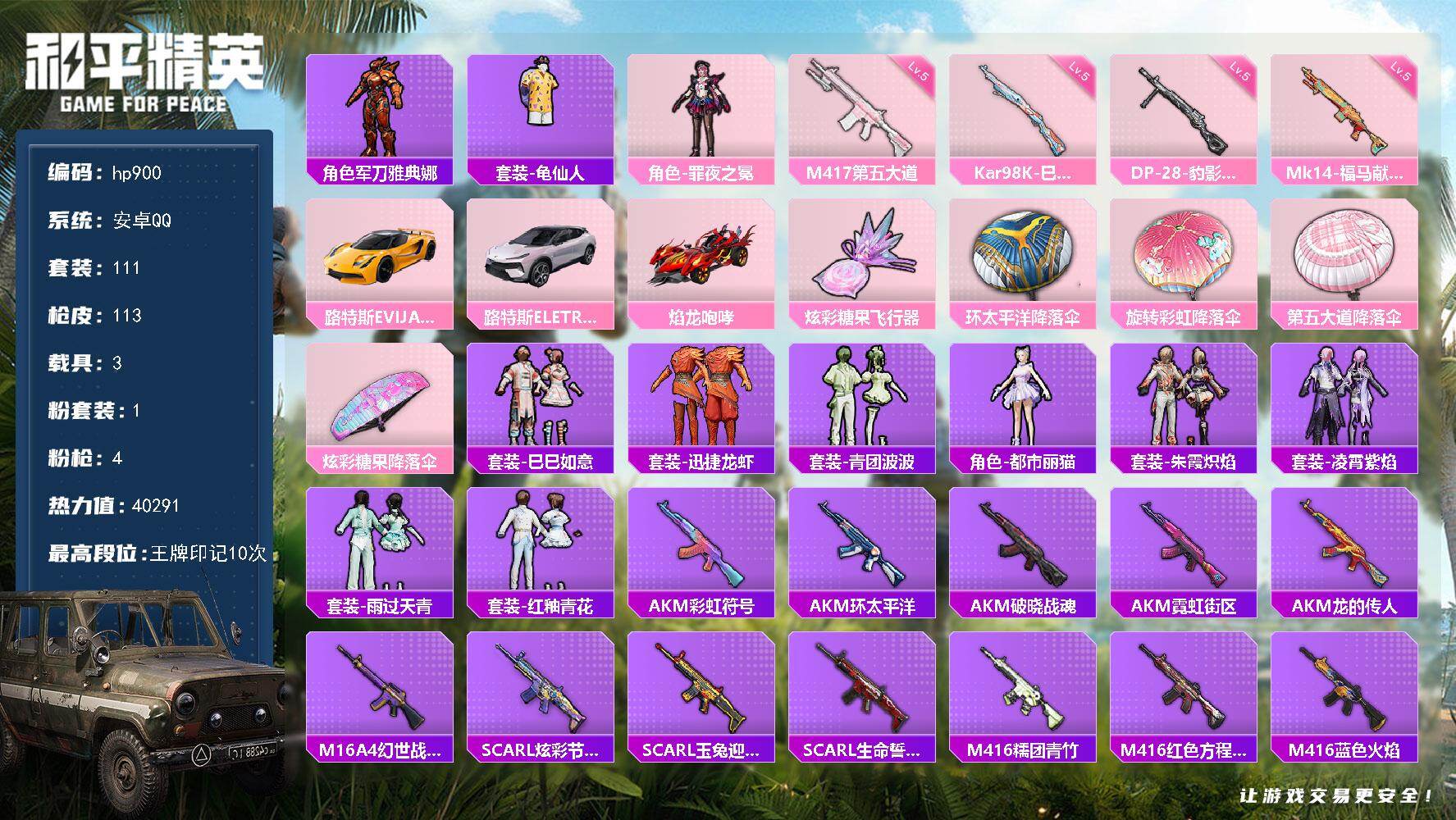 安卓 手Q-1粉装-4特效枪-3载具-1粉色飞行器-40291热力值-10王牌