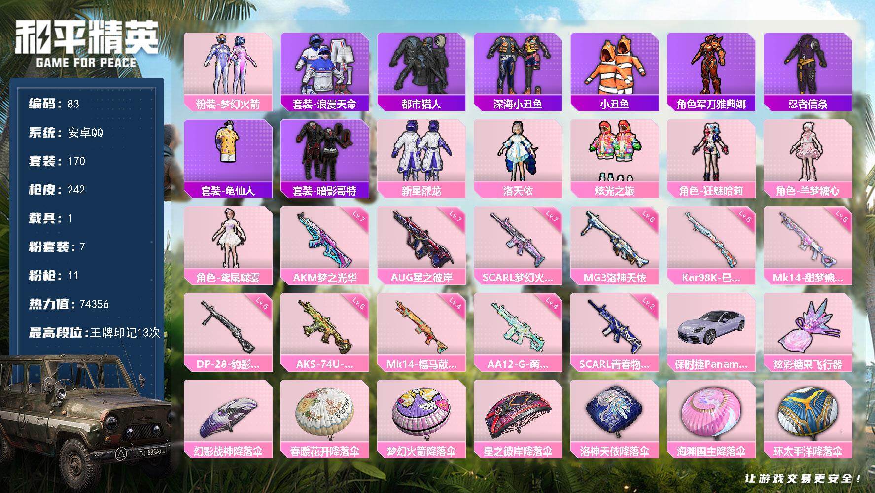 安卓 手Q-6粉装-4特效枪-4载具-1粉色飞行器-71474热力值-15王牌印