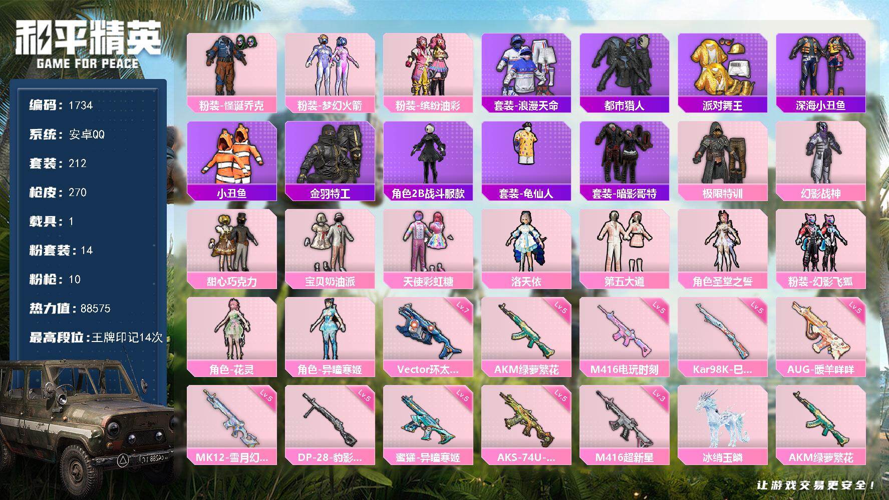安卓 手Q-14粉装-10特效枪-1载具-8粉色飞行器-88575热力值-14