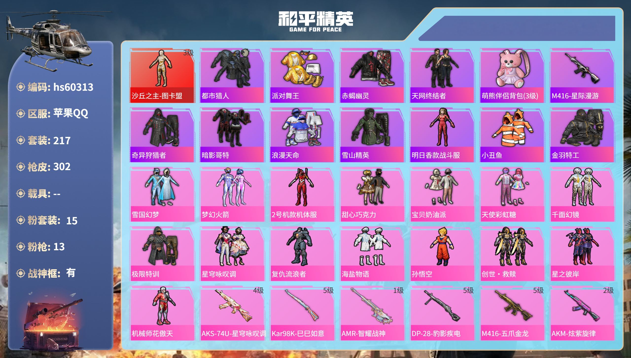 hs56256 苹果手Q-15王牌印记-10粉装-8特效枪-78789热力值-174套装-243枪皮