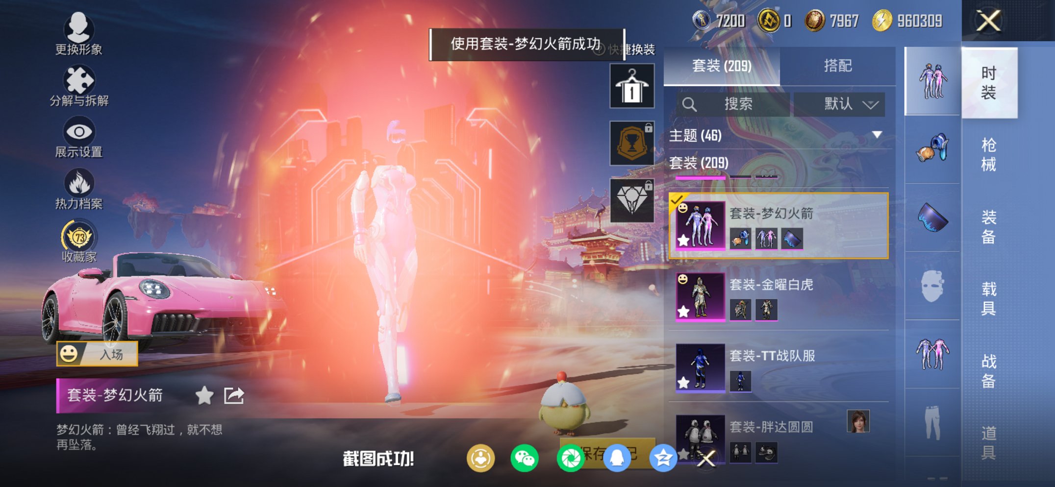 洛天依梦幻火箭等20套粉装,9级至情圣圣等7把特效枪,1车子,19个印记