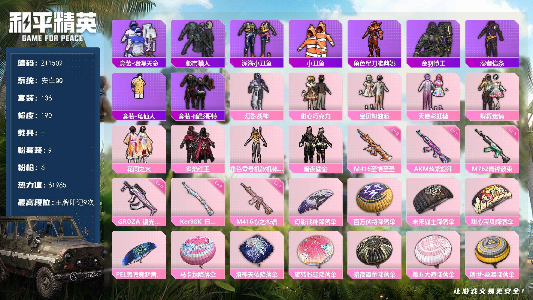 安卓 手Q-9粉装-6特效枪-0载具-0粉色飞行器-61965热力值-9王牌印记