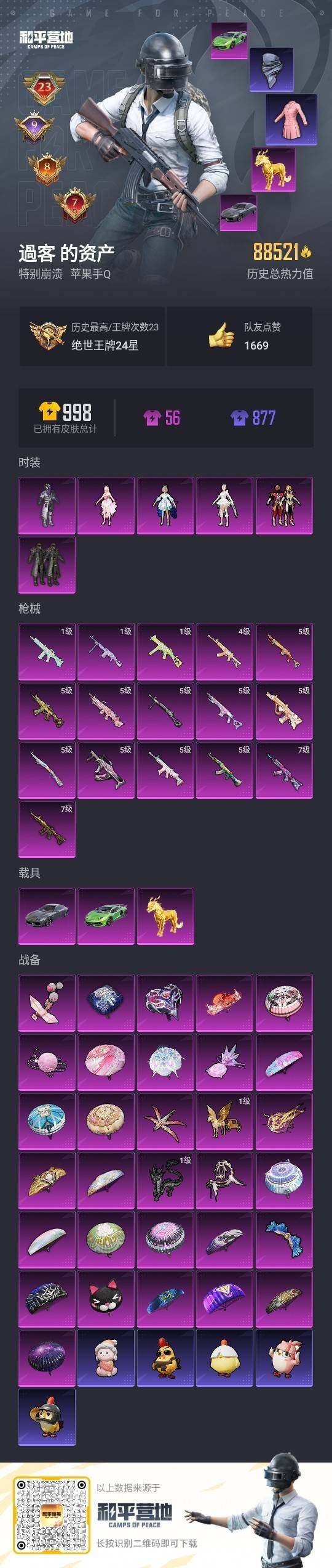 苹果 手Q-2粉装-3特效枪-2载具-2粉色飞行器-36007热力值-6王牌印