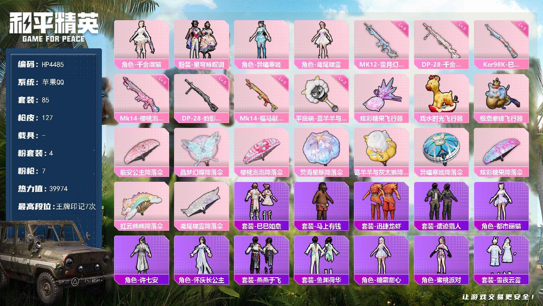 苹果手Q-31王牌印记-有战神框-27粉装-17特效枪-2载具-