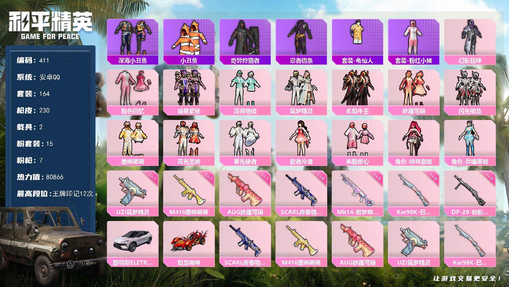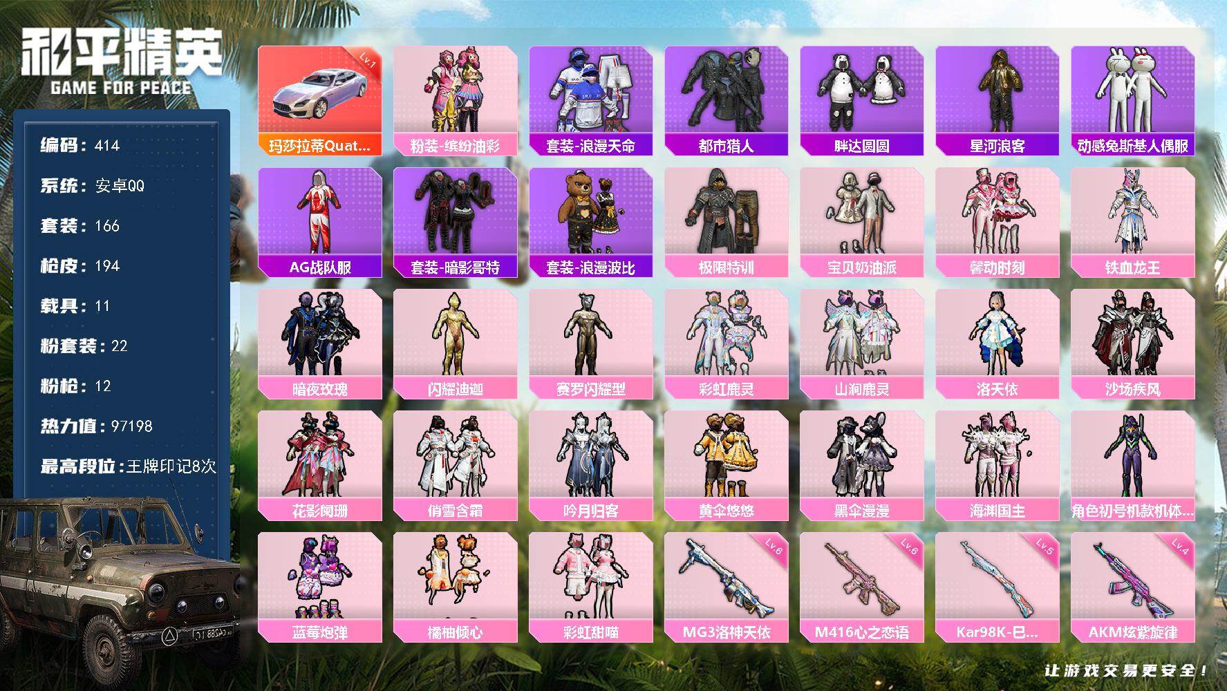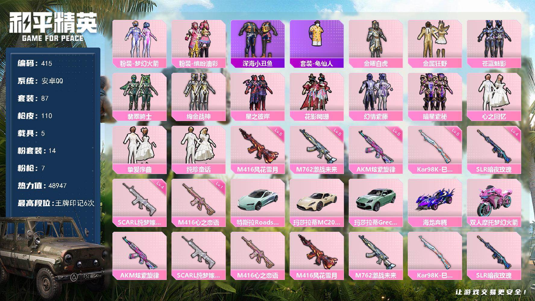安卓 手Q-14粉装-7特效枪-5载具-2粉色飞行器-48947热力值-6王牌
