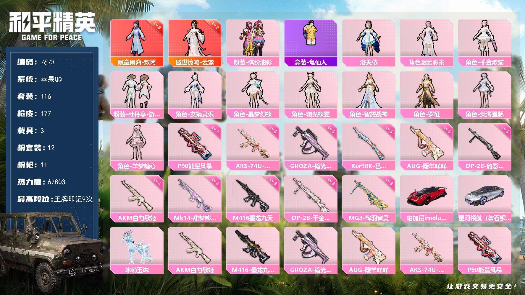 【7673】12粉装-11特效枪-3载具-67803热力值-9印记-116套装