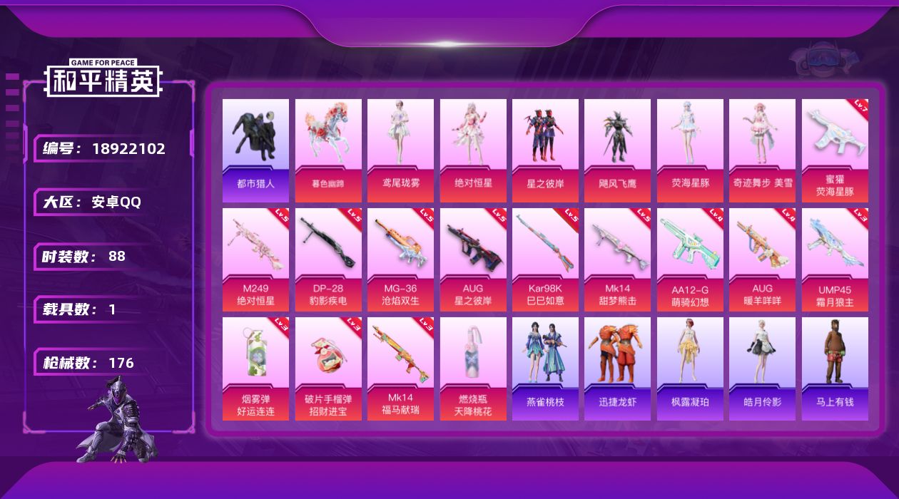 安卓 手Q-6粉装-14特效枪-1载具-6粉色飞行器-52211热力值-1王牌印