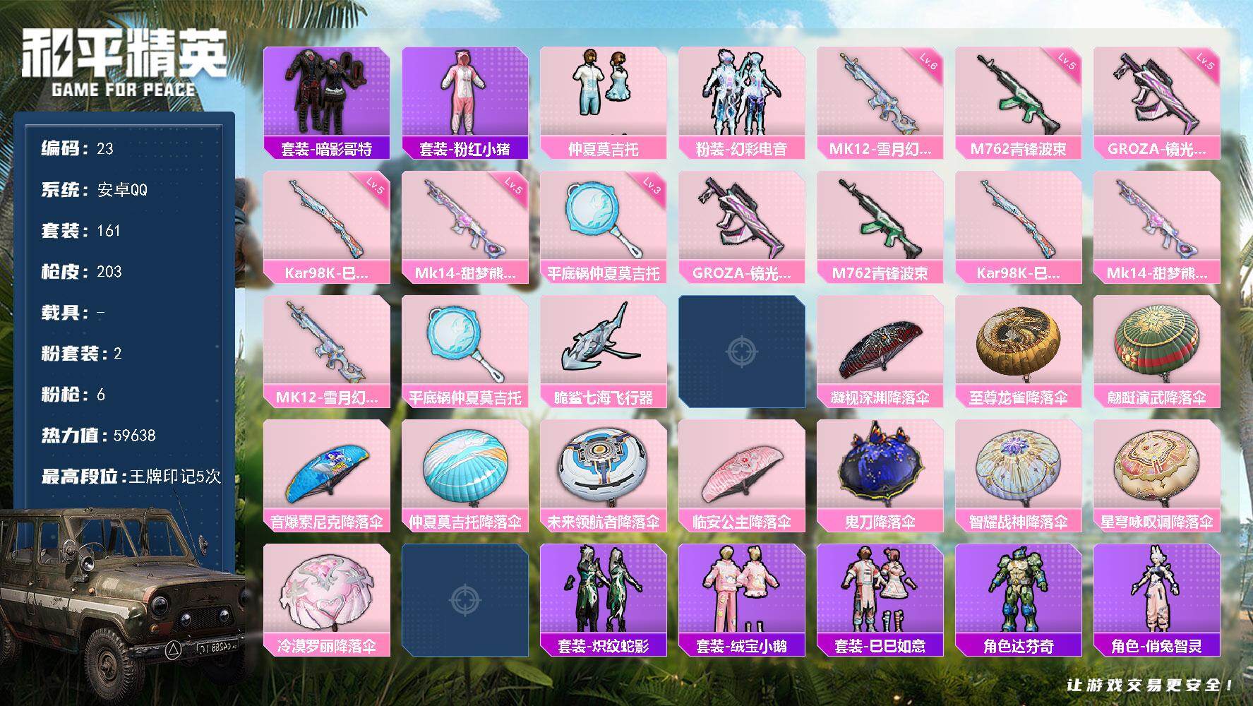 安卓 手Q-2粉装-6特效枪-0载具-4粉色飞行器-59638热力值-5王牌印
