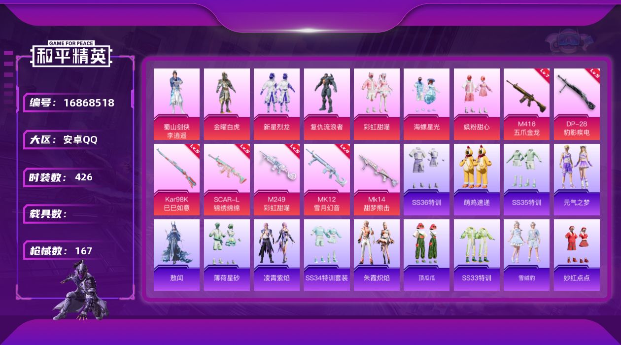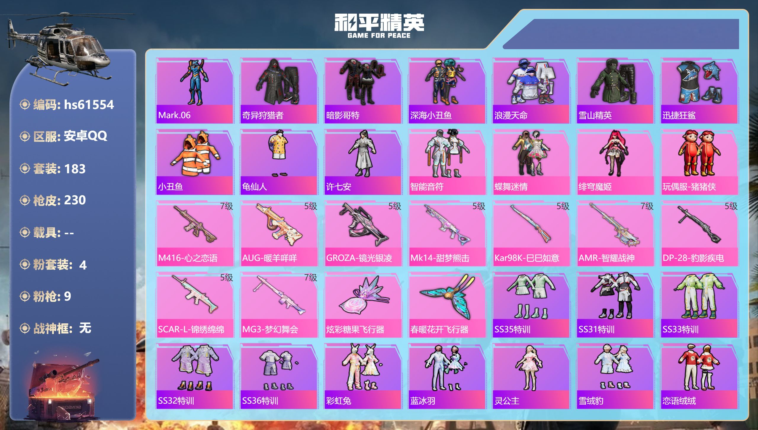 hs61554 安卓手Q-16王牌印记-4粉装-9特效枪-72153热力值-183套装-230枪皮