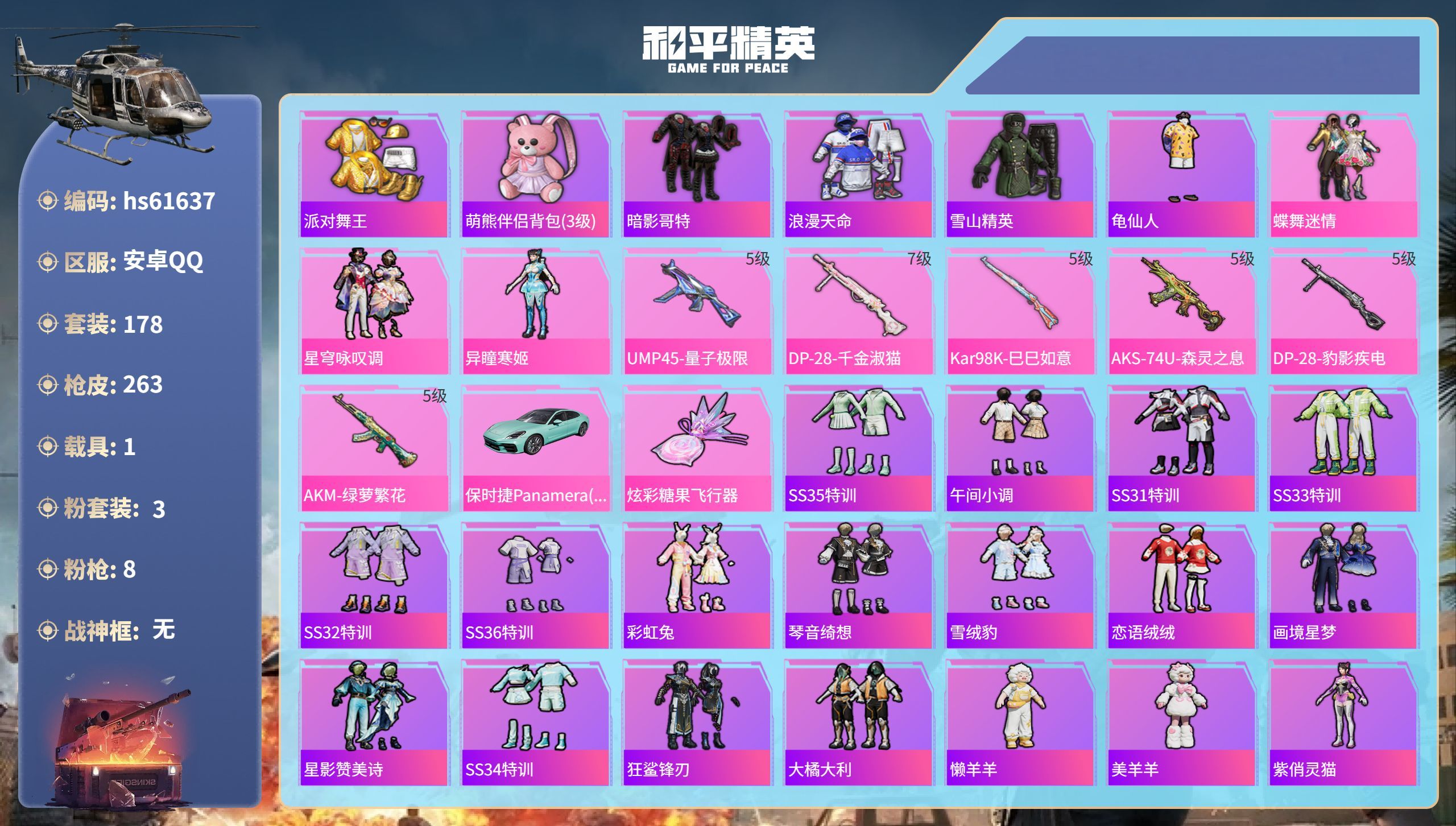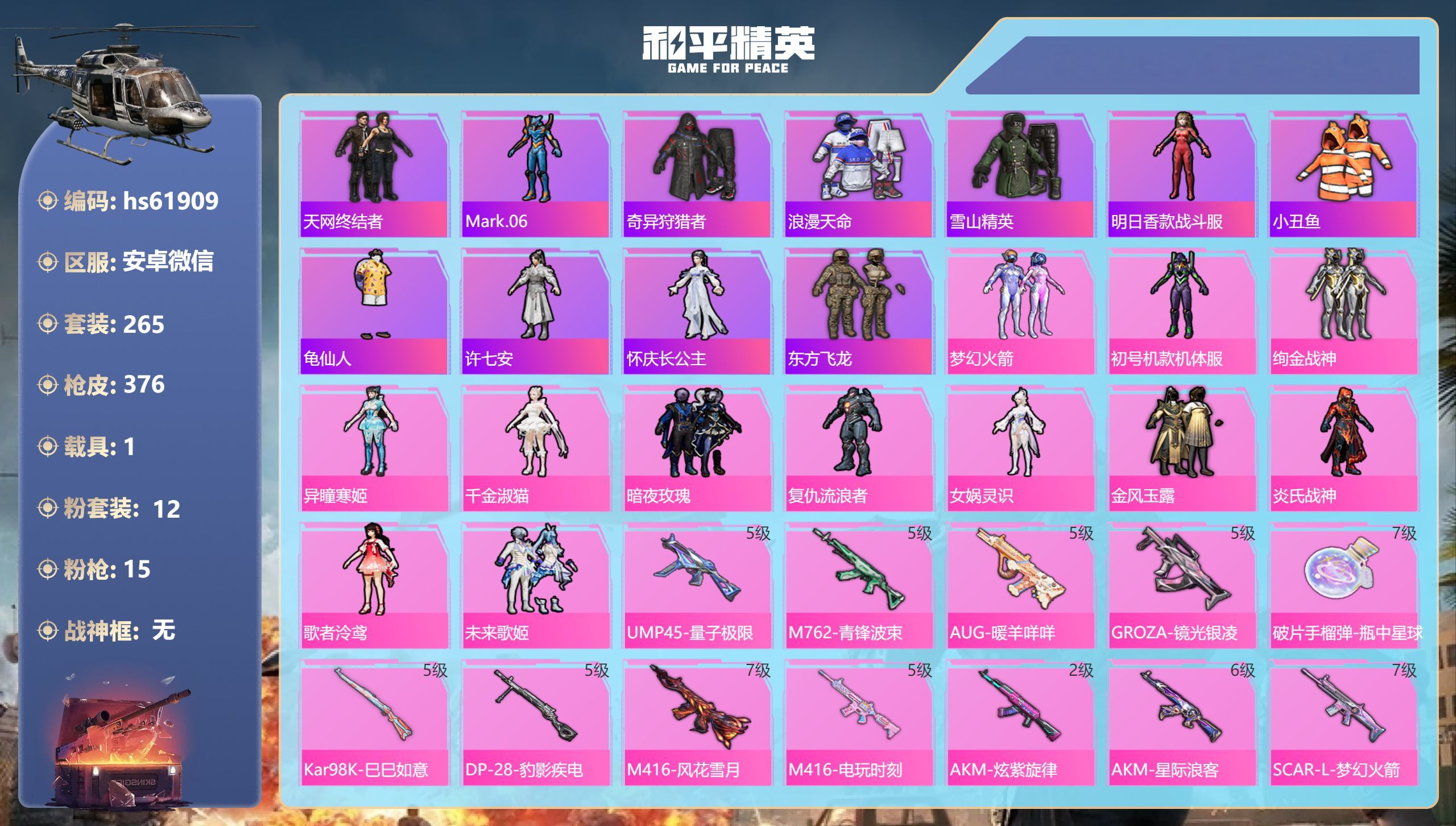 hs61909 安卓微-27王牌印记-12粉装-15特效枪-1载具-119175热力值-265套装