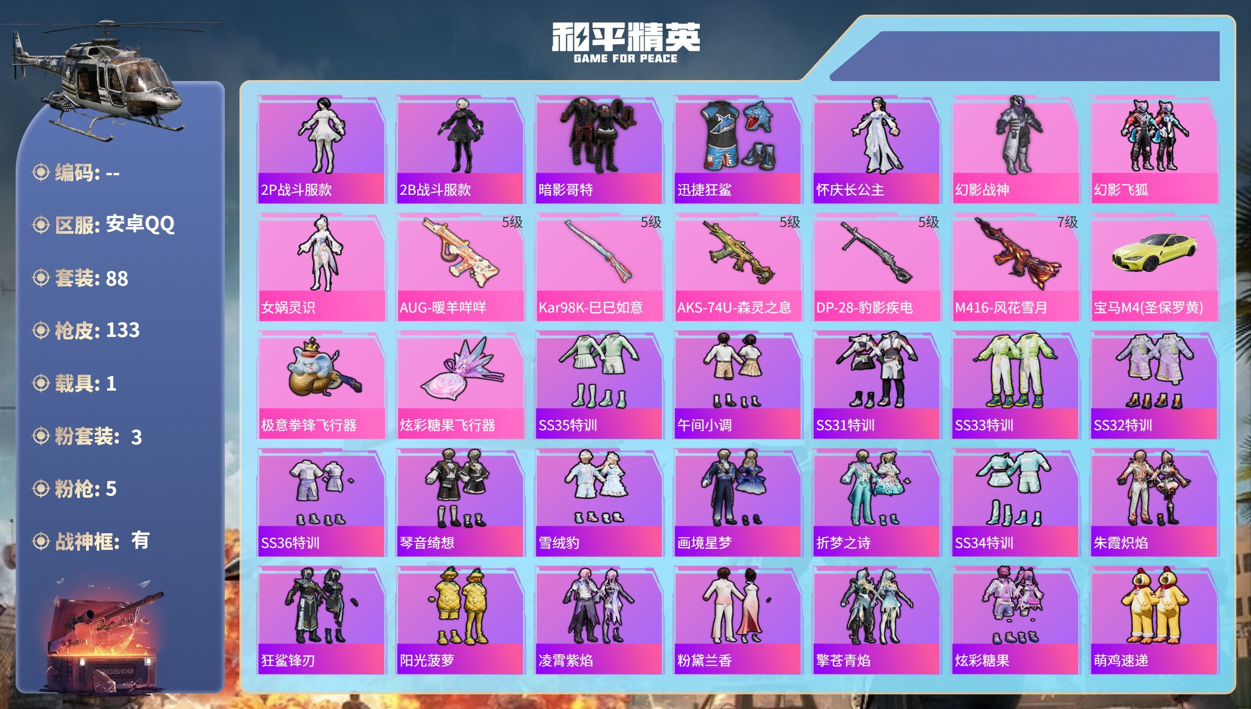 hs61599 安卓手Q-7王牌印记-有战神框-3粉装-5特效枪-1载具-41000热力值-88套装