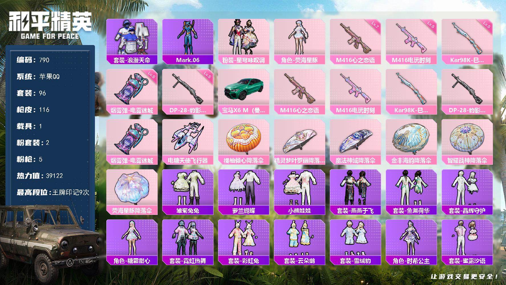 苹果 手Q-2粉装-5特效枪-1载具-1粉色飞行器-39122热力值-9王牌印