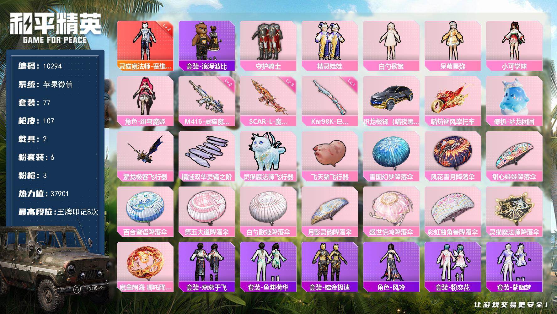 苹果 微信-1神装-6粉装-3特效枪-2载具-4粉色飞行器-37901热力值-8