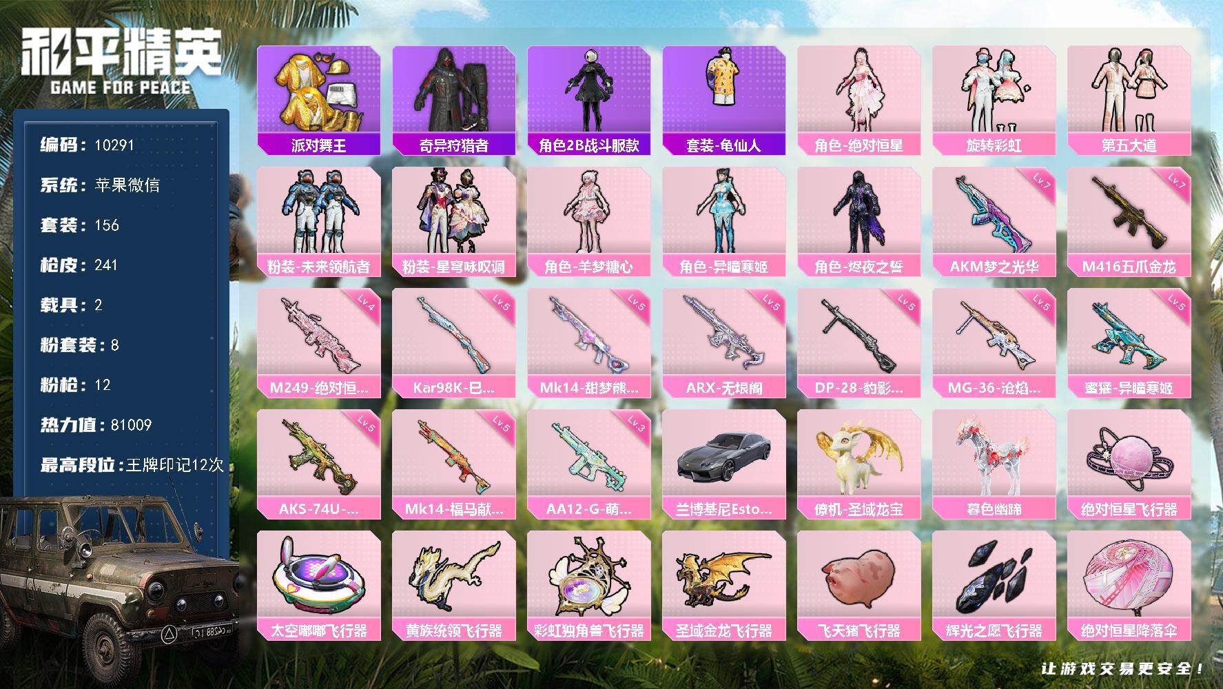 苹果 微信-1粉装-2特效枪-0载具-0粉色飞行器-12956热力值-0王牌印记